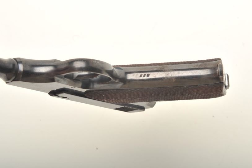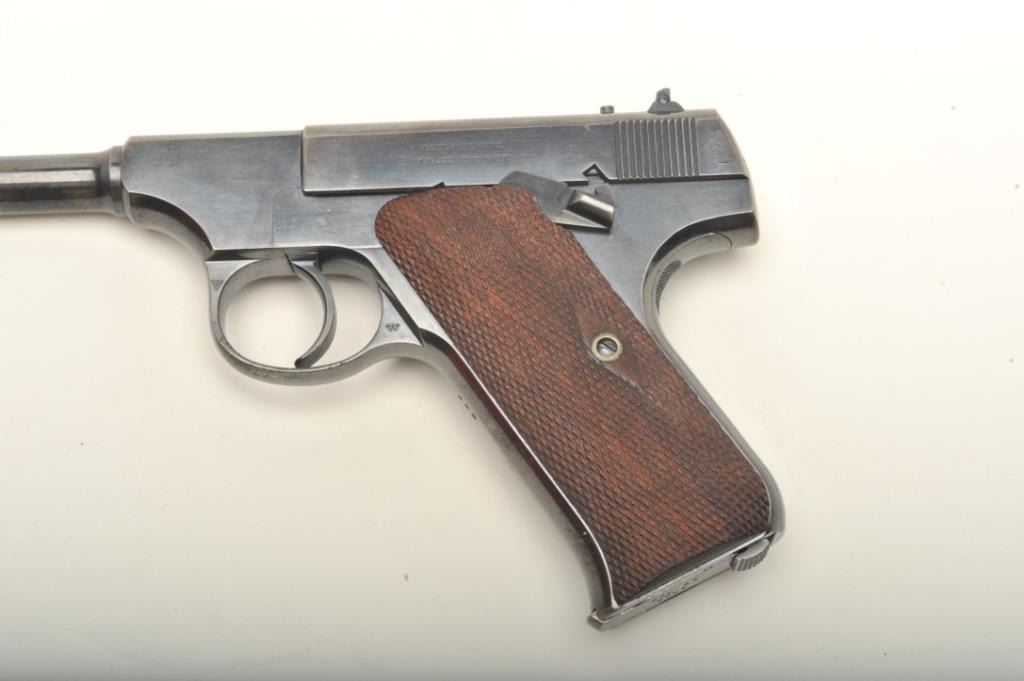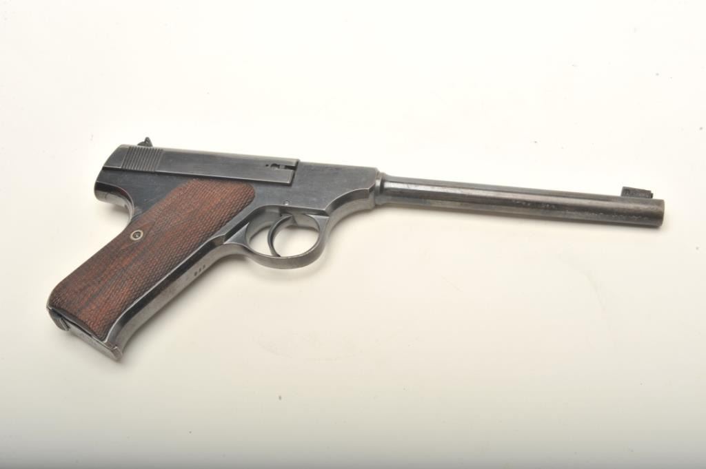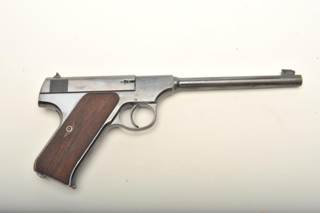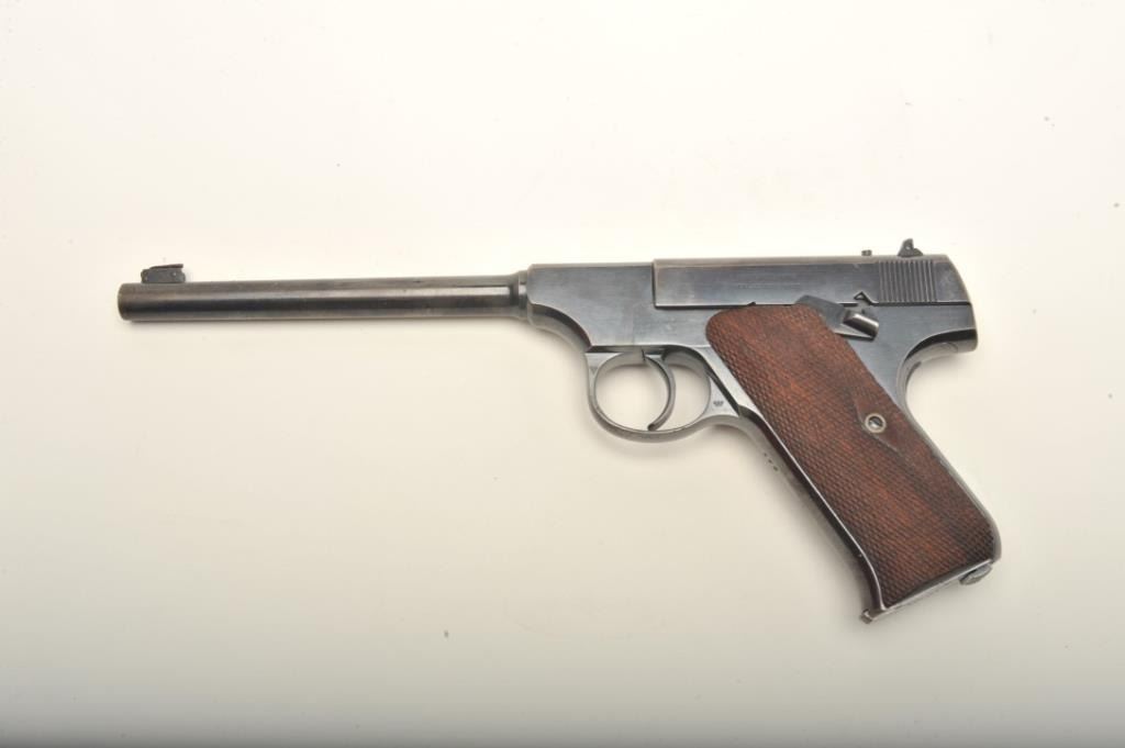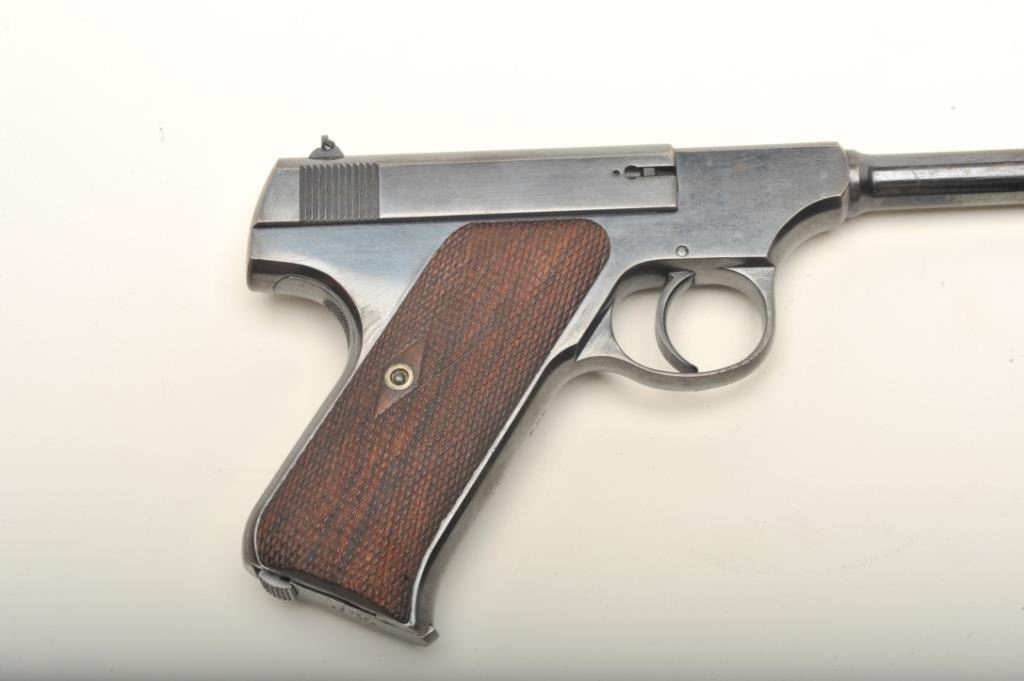 Colt Pre-Woodsman in .22 caliber, S/N 558. This pistol remains in fine to near excellent original condition retaining 85%-95% bright blue with thing towards the muzzle and straps. Rampant Colt mark at the rear of theleft slide and very early 1903 patent date along with diamond checkered wood grips. 2 tone Colt marked clip (No key hole). Near fine overall with bright bore. A very early and superior condition Colt .22 formerly inJoe Kiser collection. (C&R) Est.: $1000-$2000