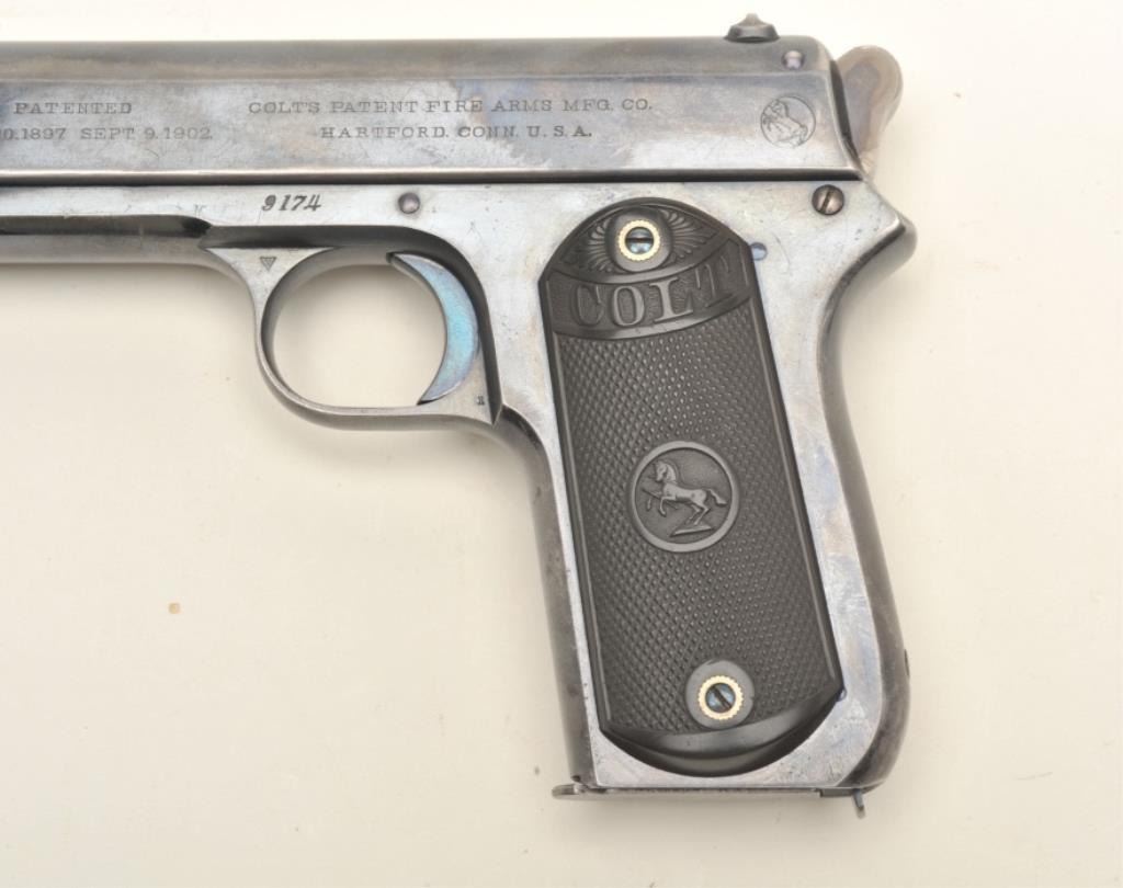 Colt Model 1902 Sporting semi-automatic pistol (ca. 1906), .38 Rimless Smokeless caliber, 6” barrel, serrations on front section of slide, blued finish, checkered hard rubber grips, S/N 9174, in overall finecondition displaying the majority of its original finish with some high point wear and thinning of blue at muzzle; crisp action and markings, fine bore and fine grips. Per Flayderman’s Guide (5B-220), approximately7,500 manufactured between 1903-1908. (C&R/PPT). Est.: $1,500-$3,000.