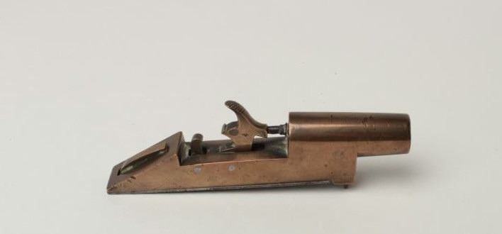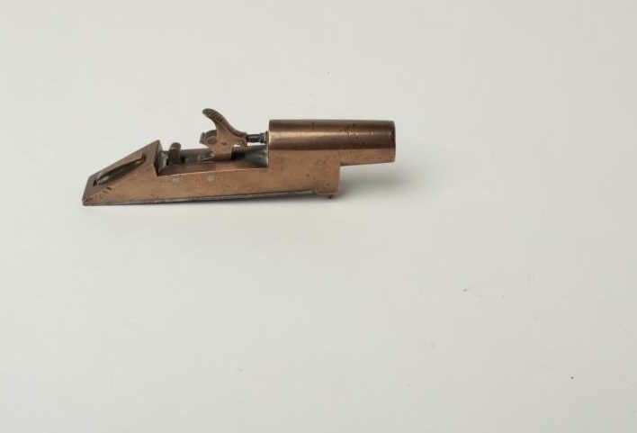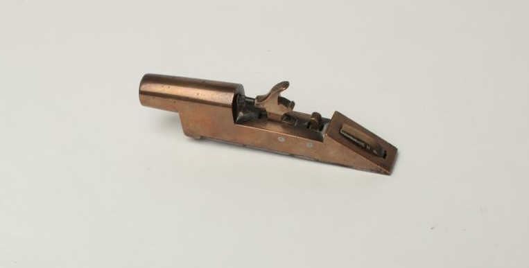 Lot 297 Brass Percussion Floor Mounted Door Alarm Gun, .58 caliber, 2.5" round brass barrel cast in one pi