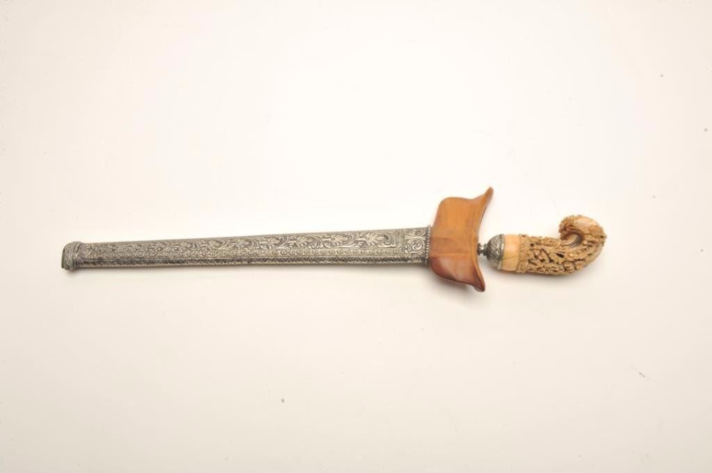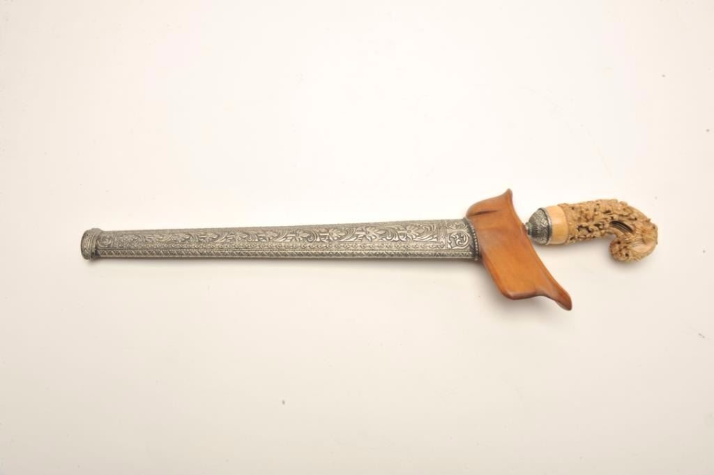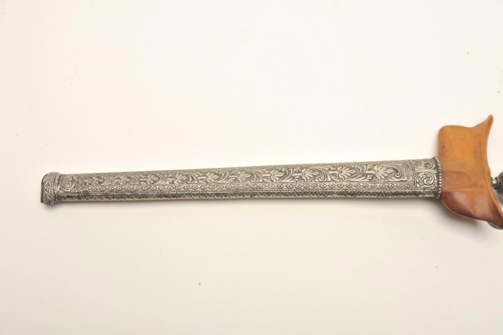 Malaysian kris circa late 18th to early 19th century of chieftain’s quality with ornately carved grip and embossed silver scabbard. Well-made meteorite steel blade. Measures 20” overall. In near fine condition. Anexceptional kris of collector’s grade. Est.: $600-$1200