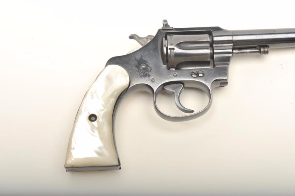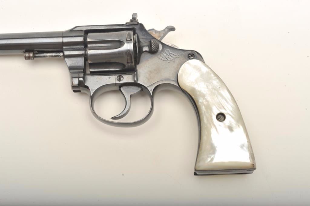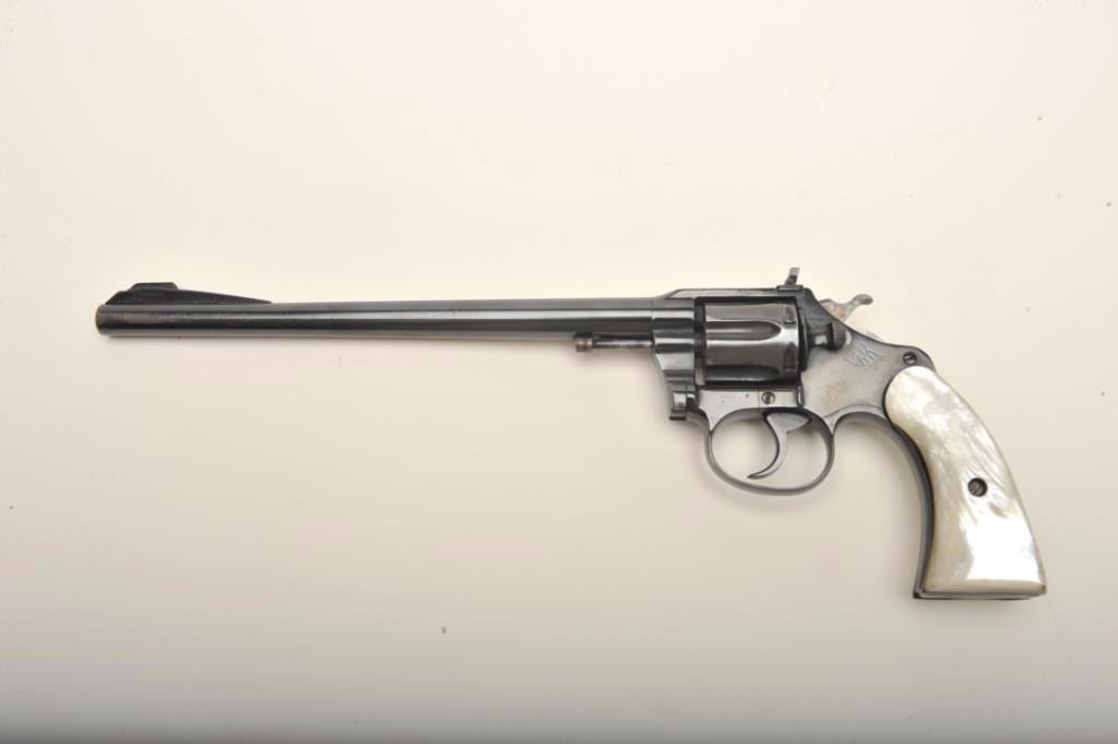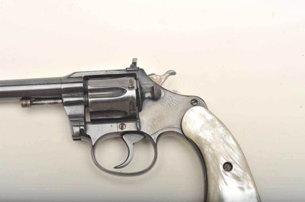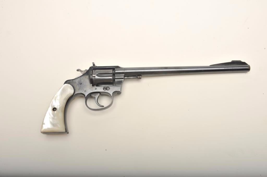Colt Police Positive in .22L.R. customized with a 9” barrel and folding rifle type rear sight with matching ramped front sight. Re-blued at the time of conversion with simulated pearl grips, S/N 2006. By tradition used in 1950’s “B” movie “Gun Crazy” and customized by Long Beach bay area pistol smith. (C&R) Est.: $400-$800