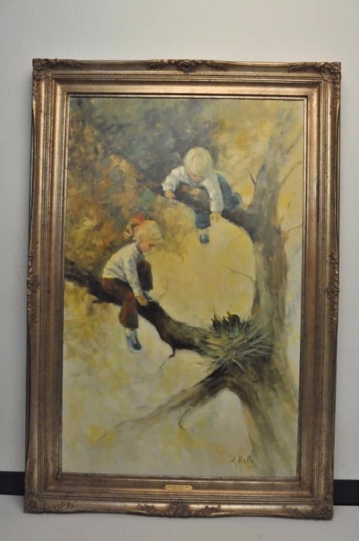 Original oil on canvas signed lower right “K. (Kathy) Kelly”. Entitled “Discovery, Bird’s Nest”. Measures approximately 48” x 30”. Est.: $900-$1800