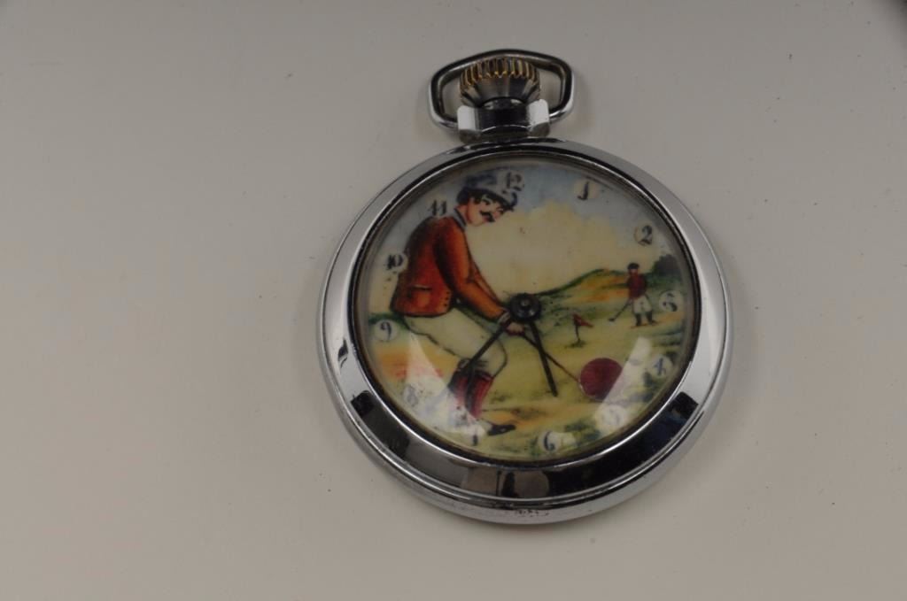 Open face pocket watch with golfers on face; not working at time of description. Est.: $50-$75.