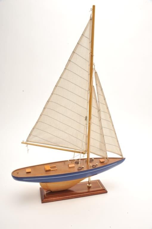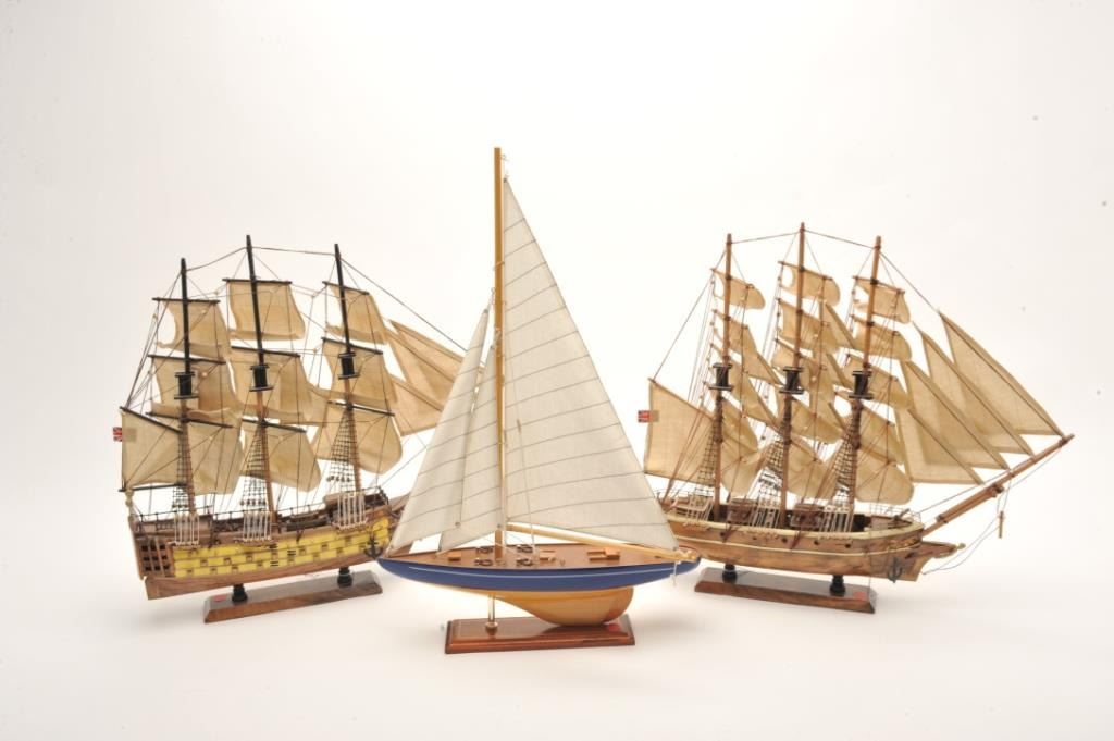 Lot of 3 beautiful sailing ship models on wood stands including the Cutty Sark, the HMS Victory and a racing sailboat. Est.: $150-$250.