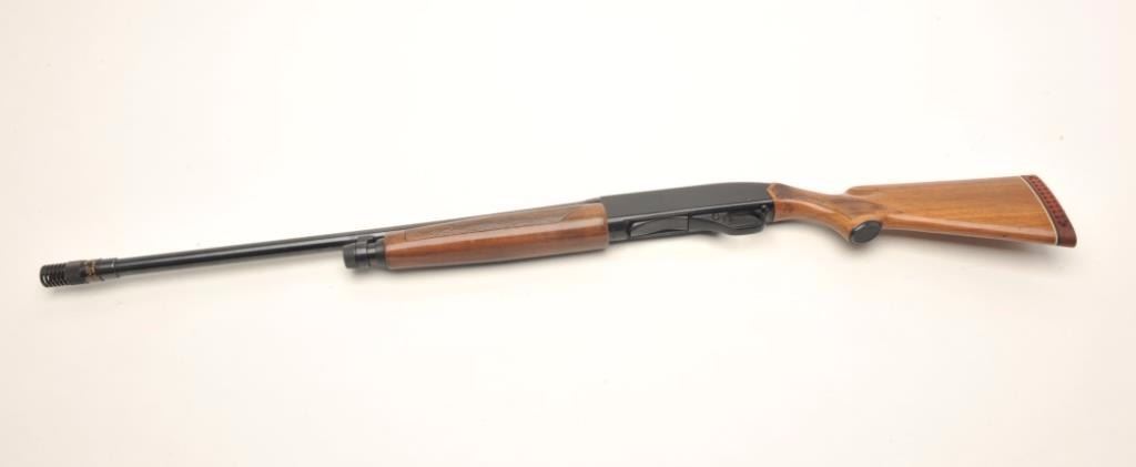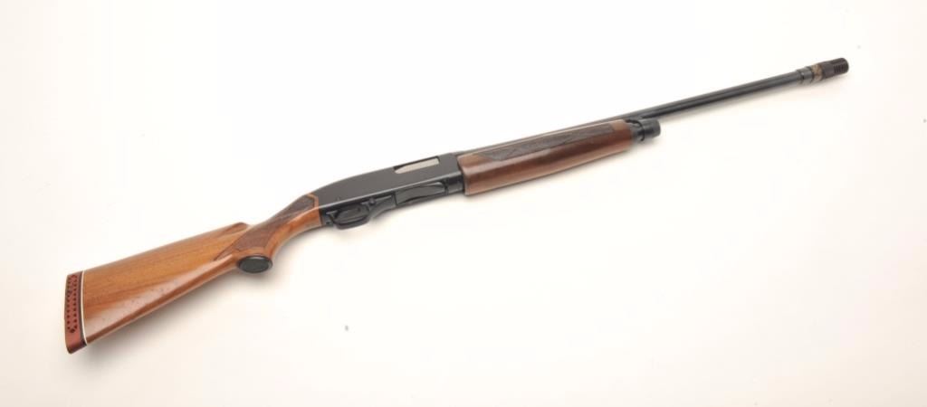 Winchester Model 1200 pump action shotgun, 12 gauge, serial #411354. The shotgun is in very good overall condition with a 27” barrel. The barrel features a Deluxe Poly-Choke and retains nearly all of itsblued finish. The receiver retains significant blued finish with scratches and light surface wear noted. The checkered wood stocks are in very good condition with small mars and compressions from field use and aventilated rubber pad providing a 14” LOP. The bore is good, the action crisp and the markings are sharp. Est.: $200-$400. (Modern).