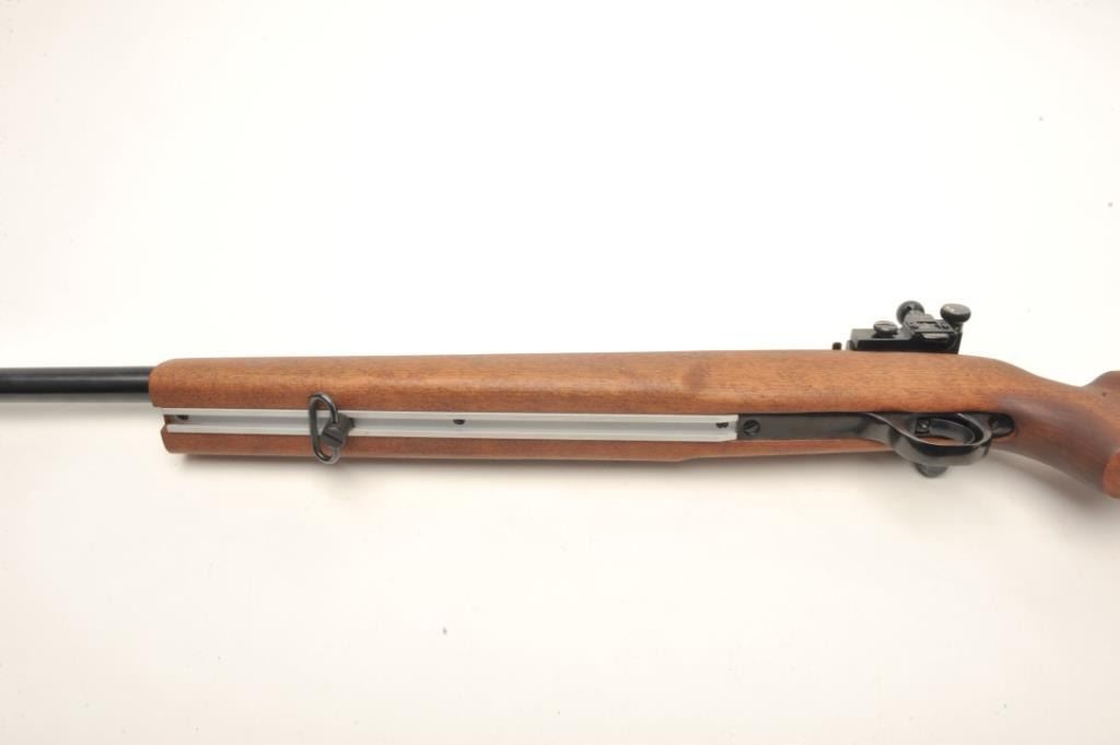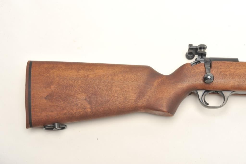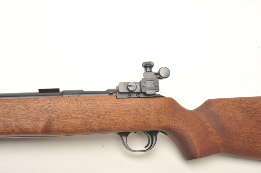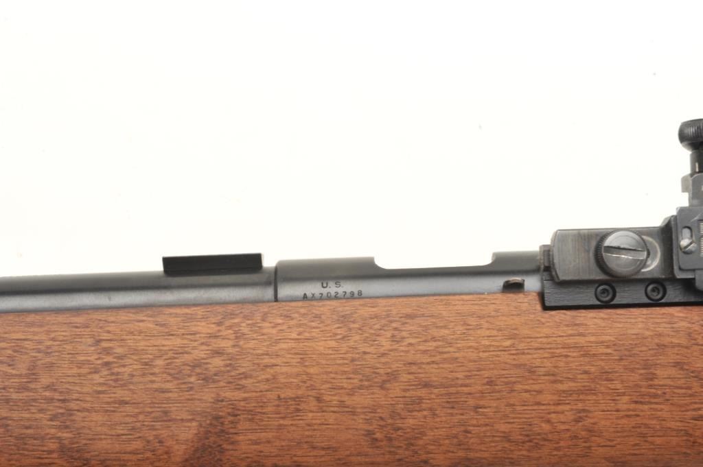 H & R Model M-12 U.S. Property marked bolt action rifle, .22 LR caliber, serial #AX702798. The rifle is in nearly fine condition with a 28” heavy barrel with a hooded front sight and Redfield International Match aperture sight on the rear of the action. The barrel shows nearly all of its blued finish with only storage marks noted. The front receiver ring is marked, “US” and retains nearly all of its blued finish. Thesmooth wood stock is in very good condition showing little use. The butt stock ends with an H & R marked rubber recoil pad. The rifle also features sling swivels and scope bases as mounted. The bore is very good, the action is crisp and markings are sharp on this desirable US marked H & R. Est.: $700-$1,000. (Modern).