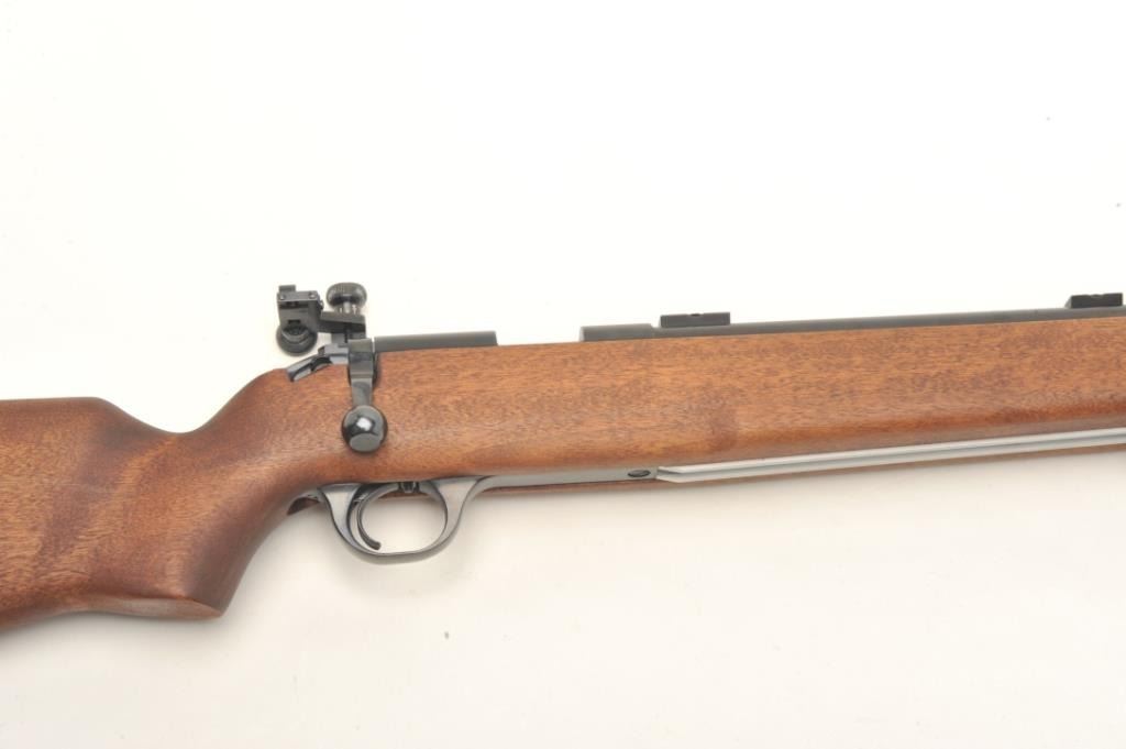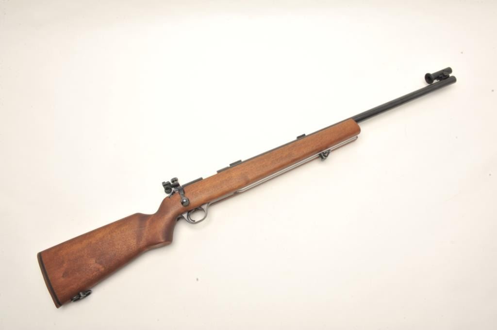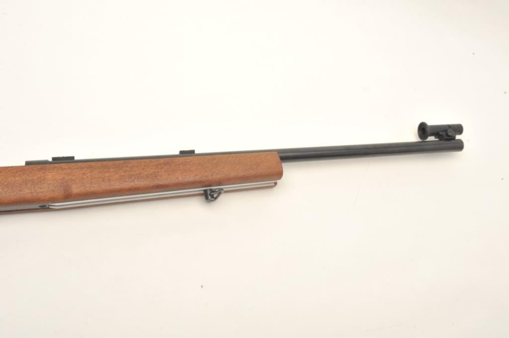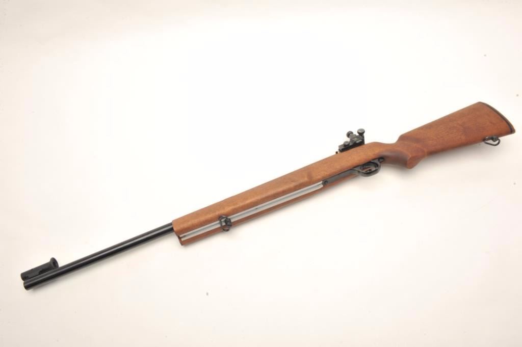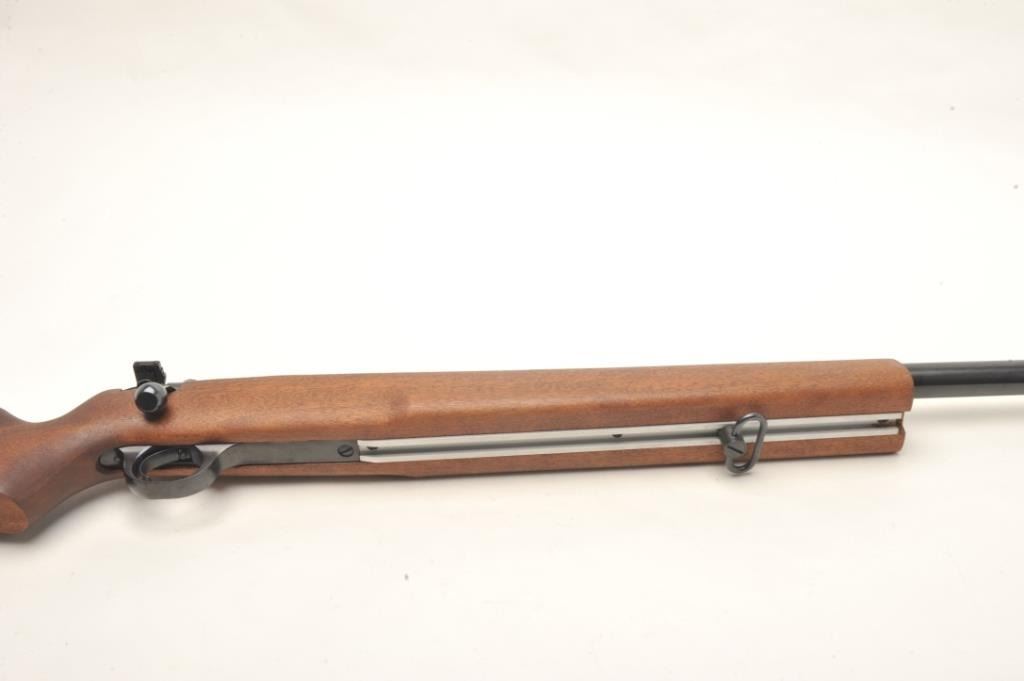 H & R Model M-12 U.S. Property marked bolt action rifle, .22 LR caliber, serial #AX702798. The rifle is in nearly fine condition with a 28” heavy barrel with a hooded front sight and Redfield International Match aperture sight on the rear of the action. The barrel shows nearly all of its blued finish with only storage marks noted. The front receiver ring is marked, “US” and retains nearly all of its blued finish. Thesmooth wood stock is in very good condition showing little use. The butt stock ends with an H & R marked rubber recoil pad. The rifle also features sling swivels and scope bases as mounted. The bore is very good, the action is crisp and markings are sharp on this desirable US marked H & R. Est.: $700-$1,000. (Modern).