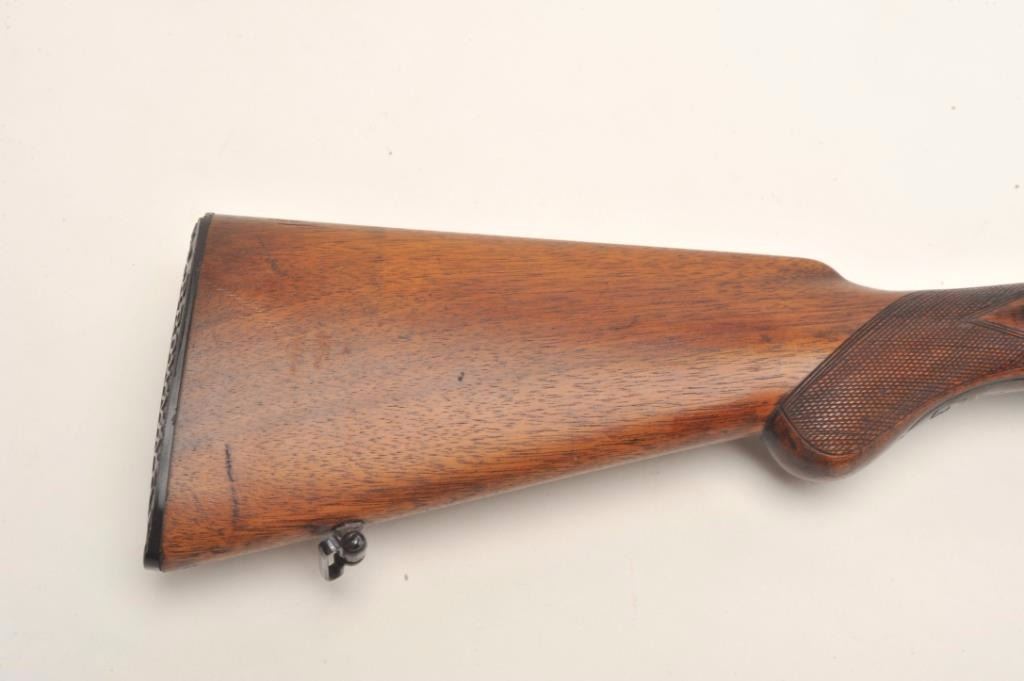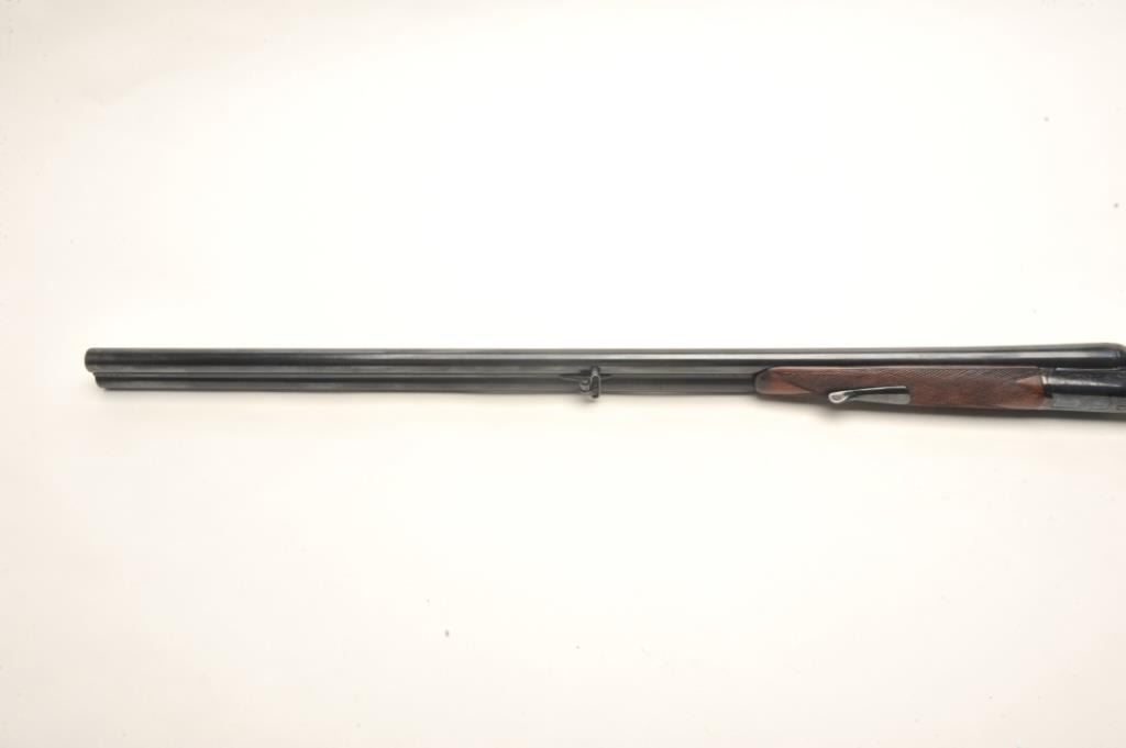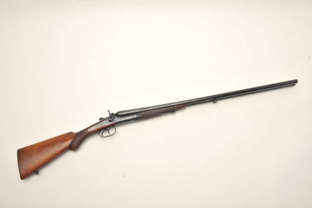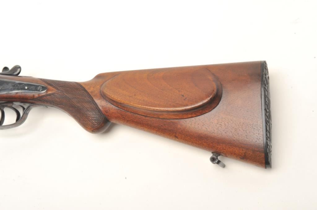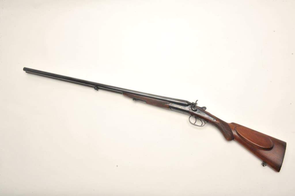 C. Hubenthal SxS exposed hammer shotgun, #61091, reblued finish, checkered walnut stock with pistol grip, cheek piece and replacement butt plate (Browning FN). Shotgun is in very good condition asrestored, bores are near excellent, action is good. Length of pull is approximately 13 1/8". A very nice German SxS. Est. $1,000-$2,000.