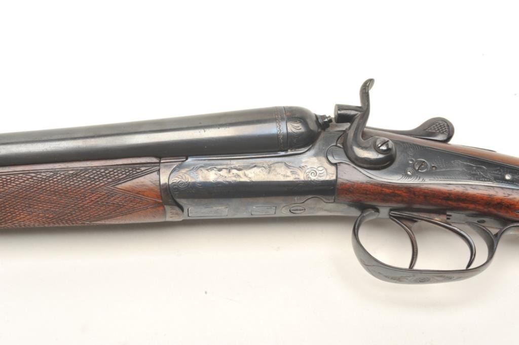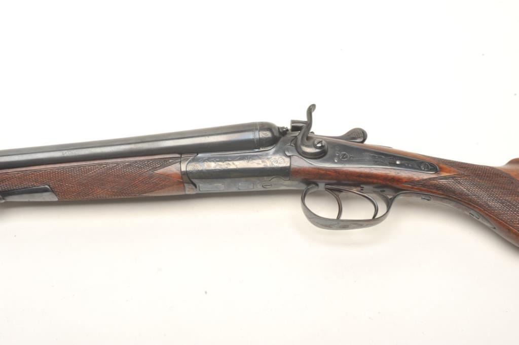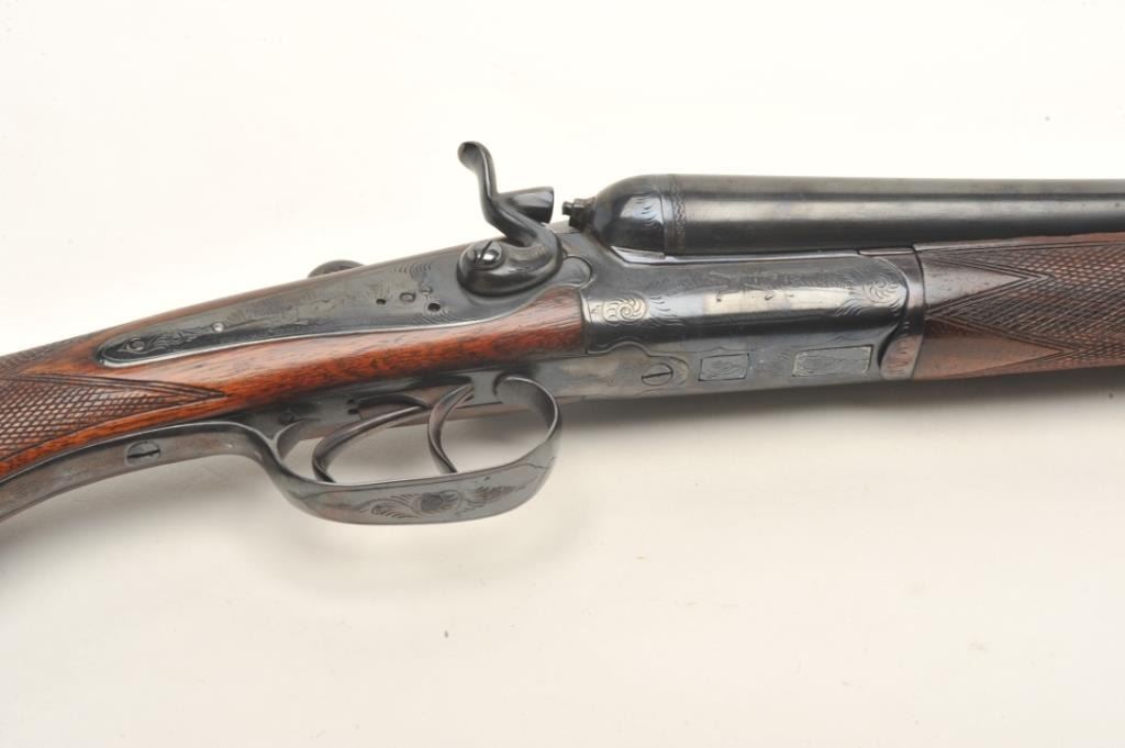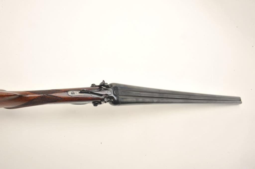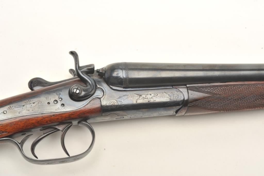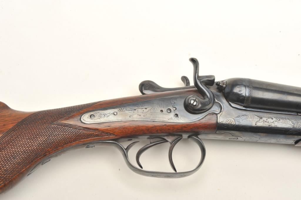 Lot 431 C. Hubenthal SxS exposed hammer shotgun, #61091, reblued finish, checkered walnut stock with pisto