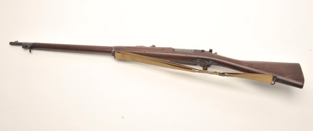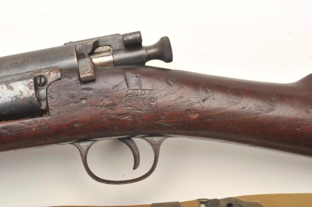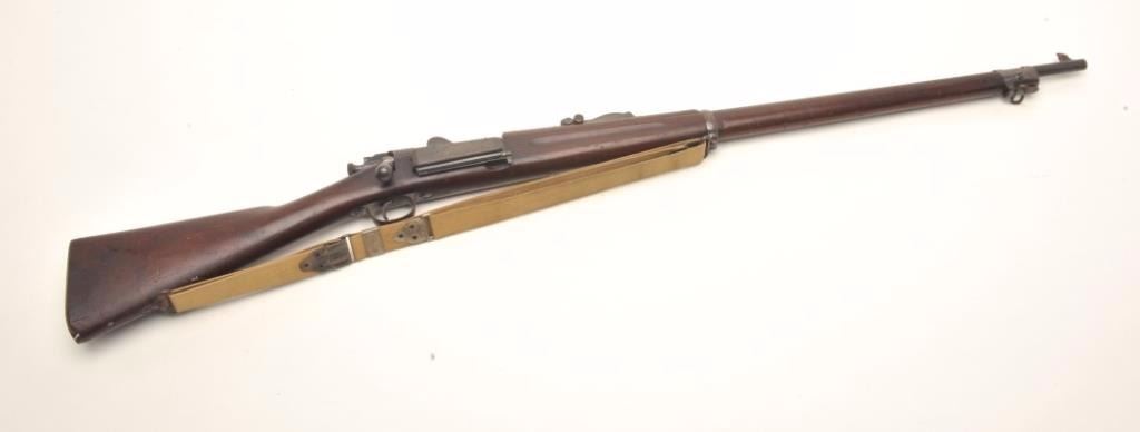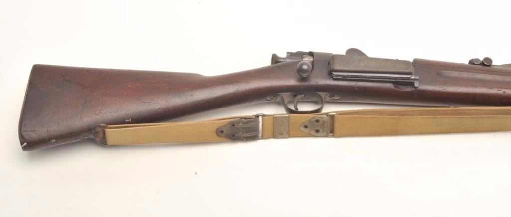 Model 1898 Krag rifle by Springfield Armory, .30-40 cal., in good original condition, serial #464367. The metal surfaces show 60-80% original blue, some erosion, light rust, minor pitting which may clean well.The stocks show a 1903 cartouche which is at least 90% visible; the stocks are good with many small dings, mars, dents, a couple of gouges consistent with military use and storage. The markings are sharp, the bore is at least good, a canvas sling is included. Marked "Nobuckl". Est.: $400-$800
