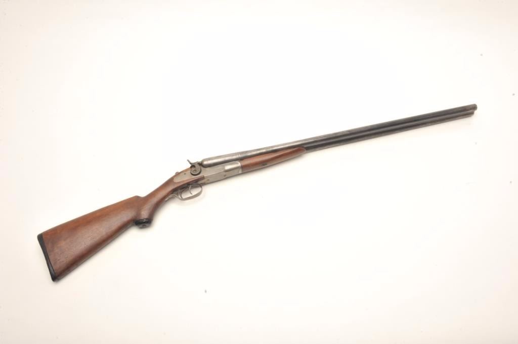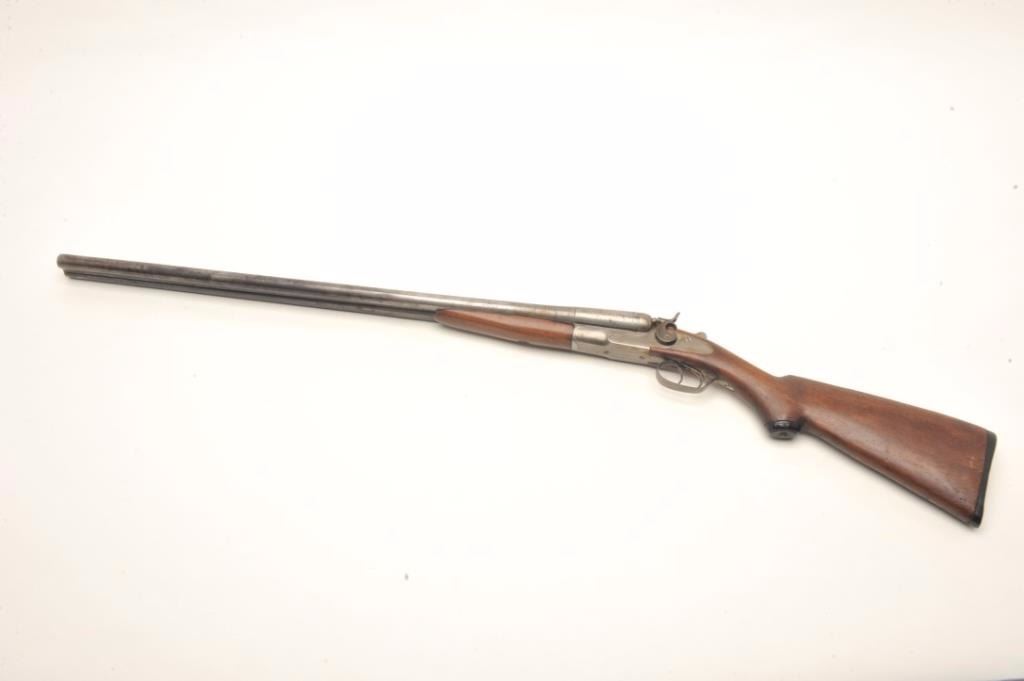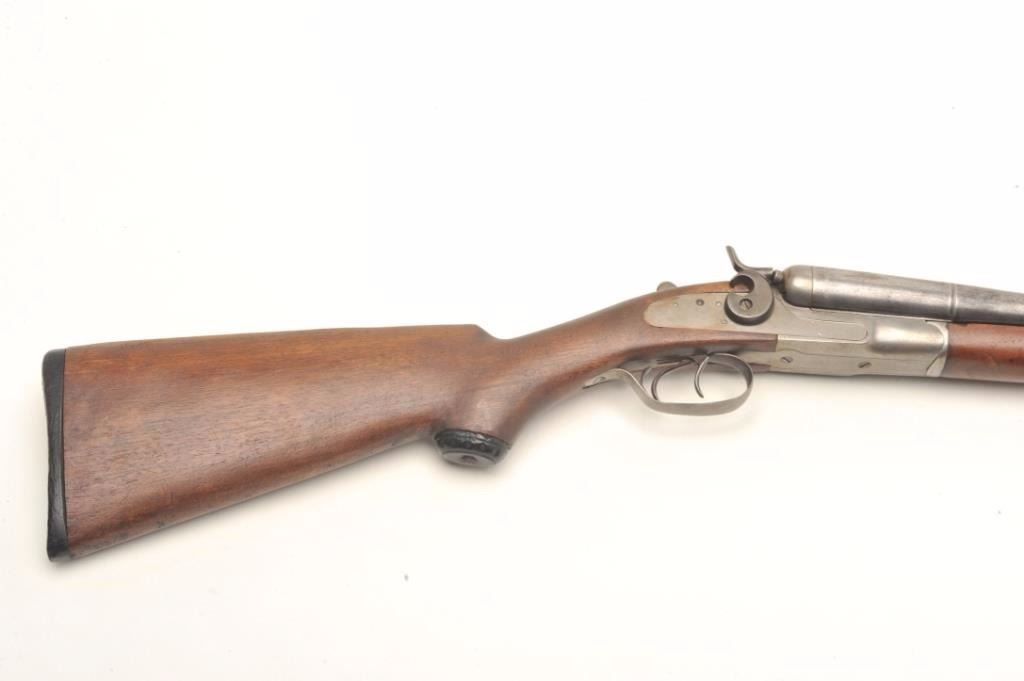 J. Stevens Damascus S x S hammer shotgun, 12 gauge, serial #NSNV. The shotgun is in good overall condition with 30” Damascus barrels with a full-length filed rib. The barrels and receiver have all gone to a silver-greypatina with light surface rust in areas. The smooth wood stocks are in fair overall condition showing heavy use with mars, dents and compressions. The butt ends with a hard rubber pad and a 14”LOP to the front trigger. The bores are fair, the action crisp and markings are legible. $125-$250. (C+R).