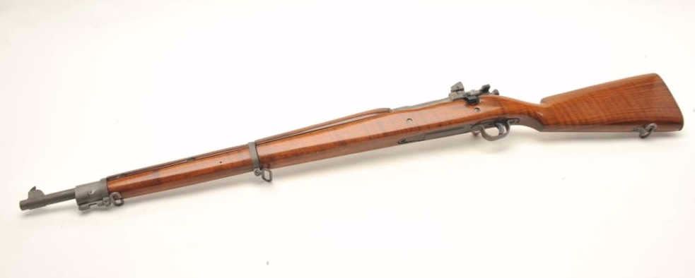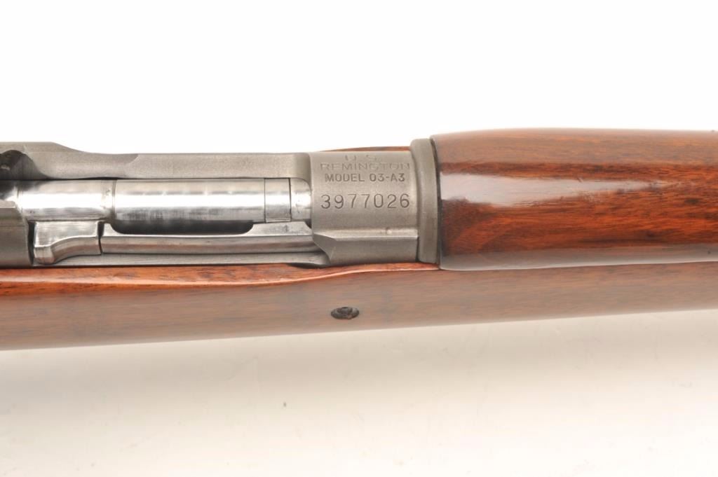 U.S. Remington Model 03-A3 bolt action rifle, .30 caliber, serial #3977026. The rifle is in very good condition as re-finished. The barrel retains nearly all of its military finish and shows the RA over flaming bombproof, dated 6-43. The receiver also shows the majority of its military finish while the bolt has been engine turned as has the bolt handle. The smooth wood stocks are in very good condition as re-finished in a highgloss. The butt ends with a checkered steel butt plate with trap. The bore is good; the action crisp, the markings are clear and the trigger has been fitted with a shoe. The rifle includes sling swivels as added. Est.: $400-$800. (C+R).