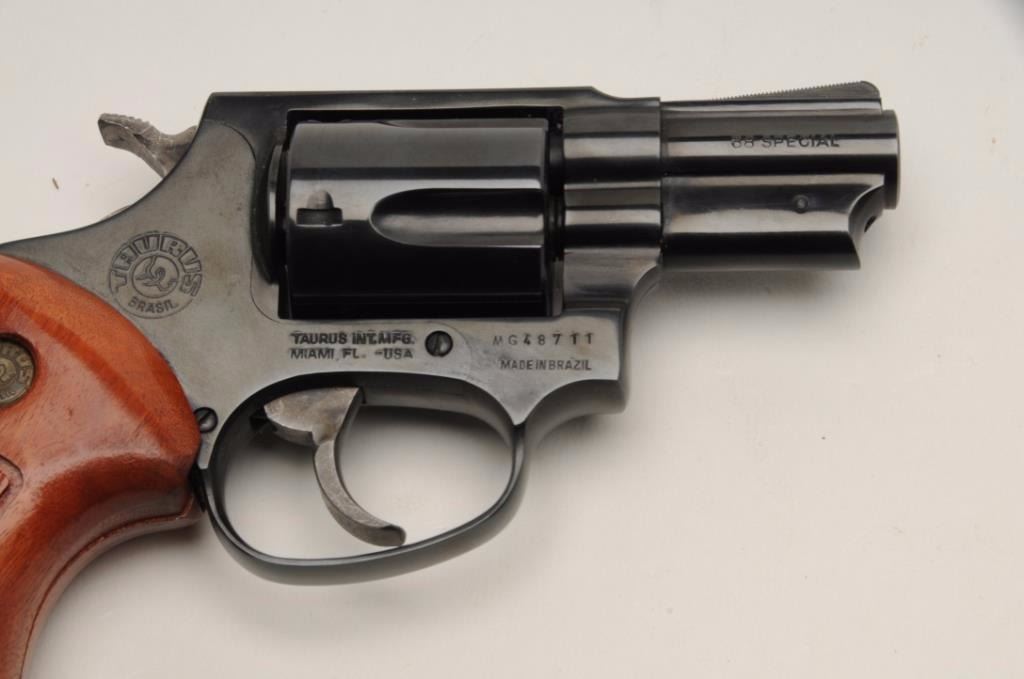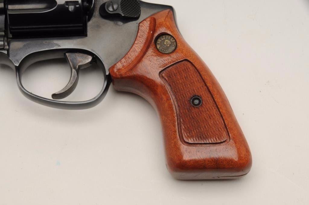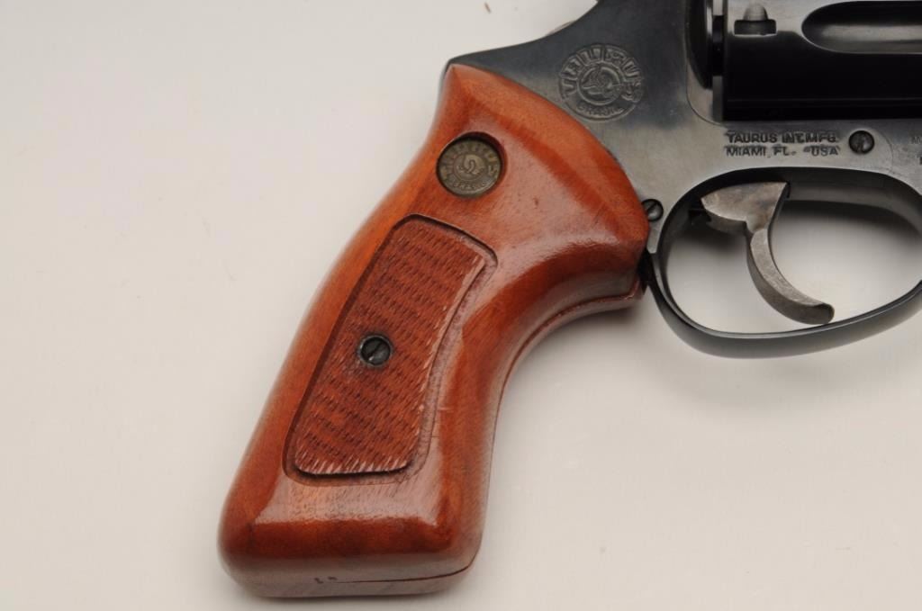 Taurus Model 85 revolver, .38 Special caliber, serial #MG48711. The pistol is in very good to nearly fine condition with a 2” barrel. The pistol retains nearly all of its blued finish with only light handling marksnoted. The hammer and trigger show significant case color. The checkered wood medallion grips are in excellent condition with sharp checkering and storage marks. The bore is very good; the action is crisp andmarkings sharp. Est.: $175-$350. (Modern).