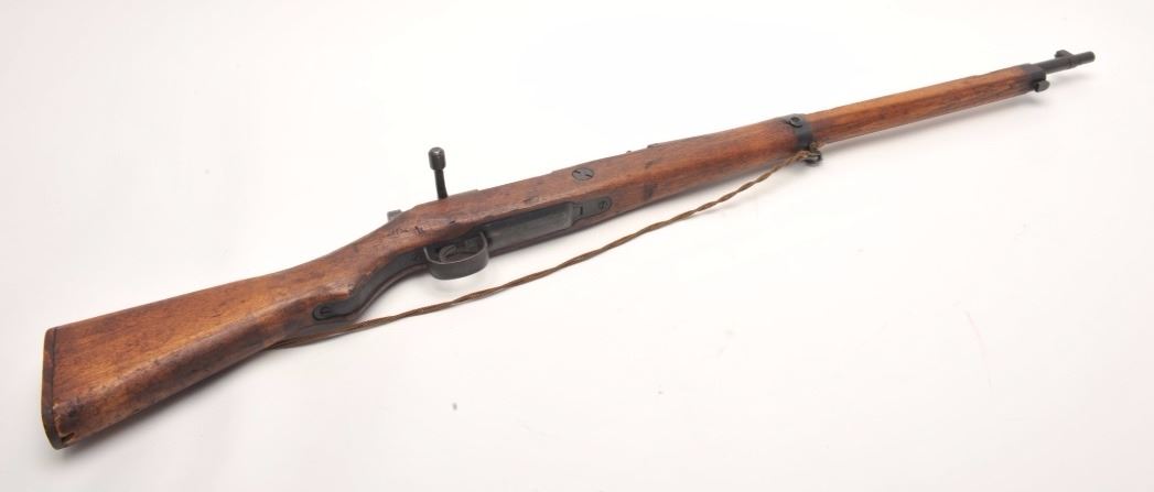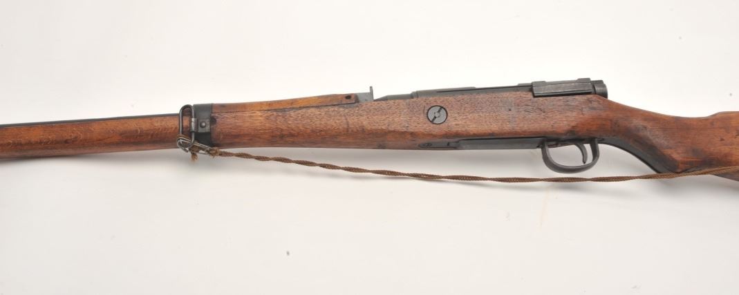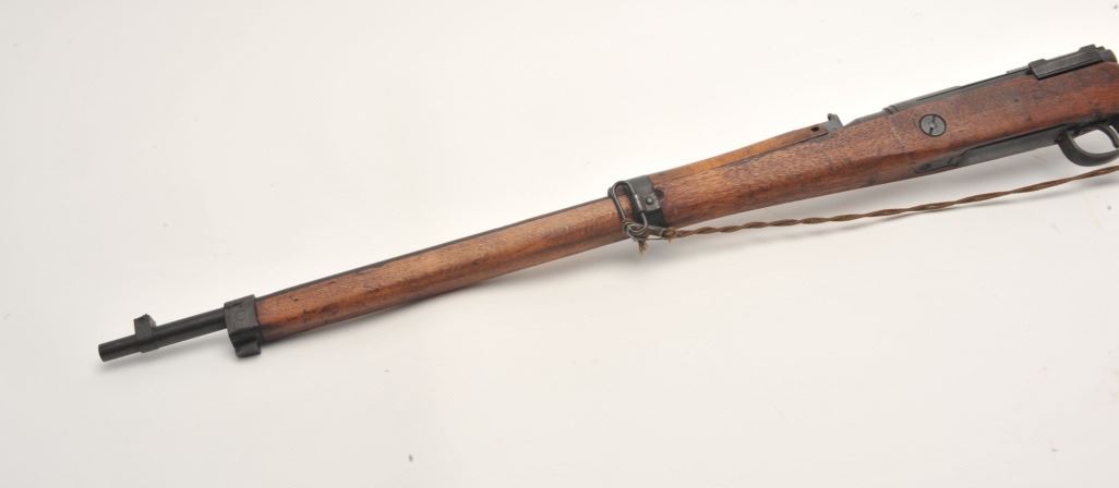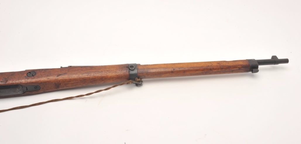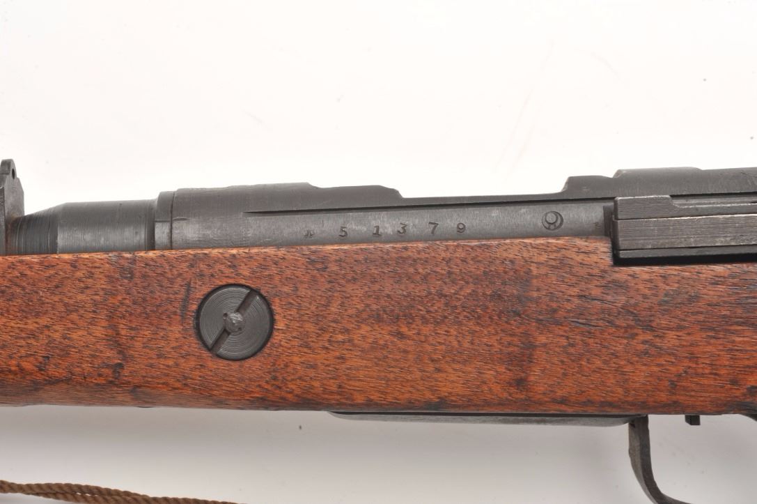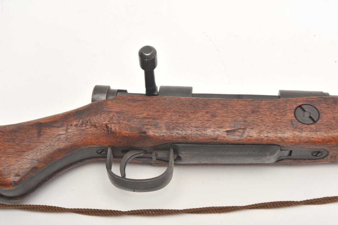 Arisaka Model T-99 Last Ditch rifle, 7.7 mm, serial #51379. The rifle is in good overall condition with a 26” barrel. The barrel and receiver retain the majority of their blued finish with light to moderate surface rust,particularly on the magazine base. The Mum has been ground off the front ring of the receiver. The smooth wood stock is in good condition with mars and compressions consistent with service use. The butt stockhas slings swivels and a twine sling added. The bore is good, the action functions and the markings are legible. Est.: $400-$600. (C+R).