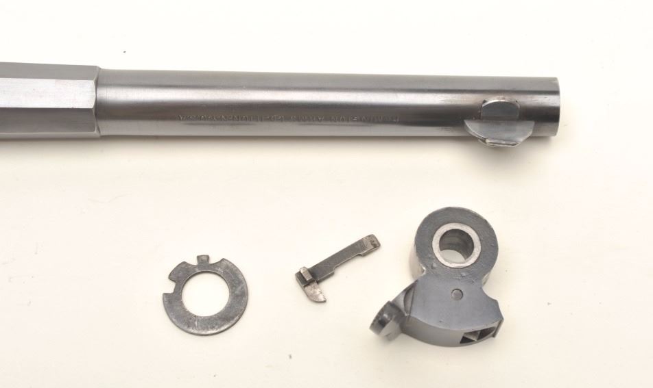 Breech block and barrel for a Remington Model 1901 Rolling Block pistol in .44 S&W Russian caliber; well-marked, excellent bore, near fine condition. Est.: $400-$800.