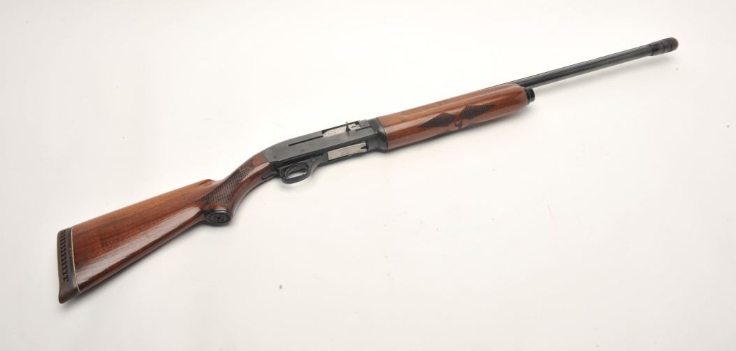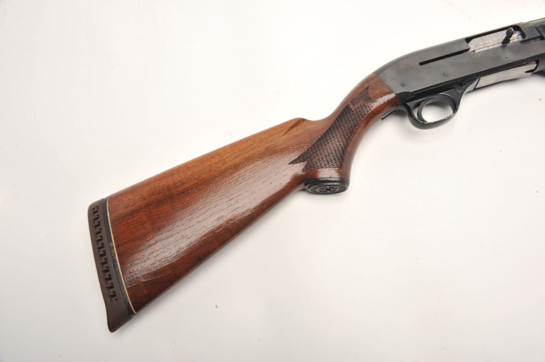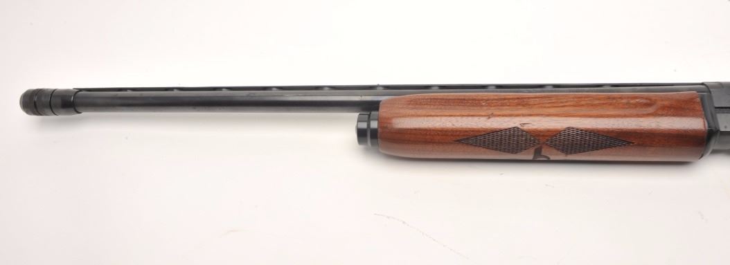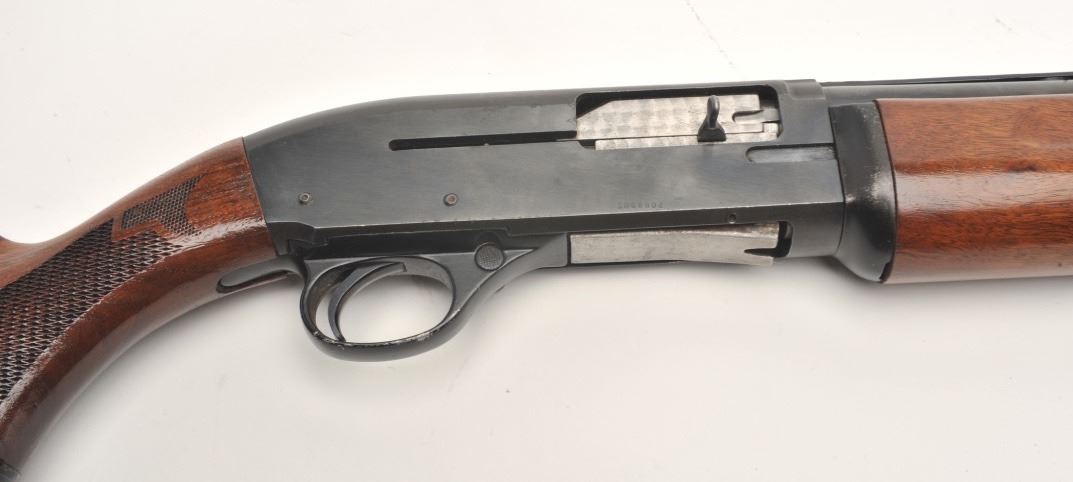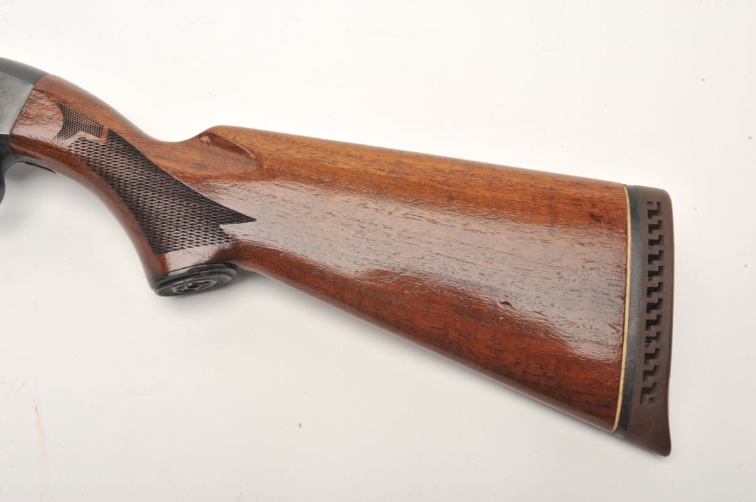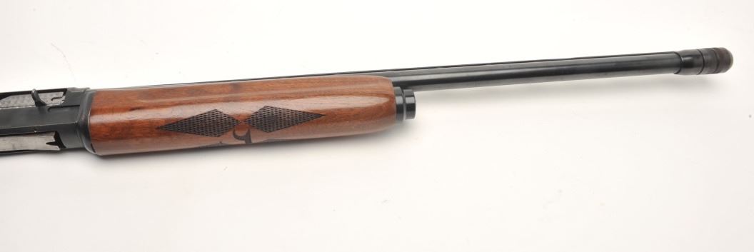 High Standard Deluxe Model C1200 semi-auto shotgun, 12 gauge, serial #3068802. The shotgun is in very good overall condition with a 27” barrel with full-length ventilated rib. The barrel sports an adjustable chokeat the muzzle and retains the majority of its blued finish. The receiver shows small mars and some light surface rust but retains significant original blue finish. The checkered wood stocks are in very goodcondition with small handling marks and a ventilated rubber pad providing a 14” LOP. The bore is good, the action crisp and the markings are sharp. Est.: $150-$300.