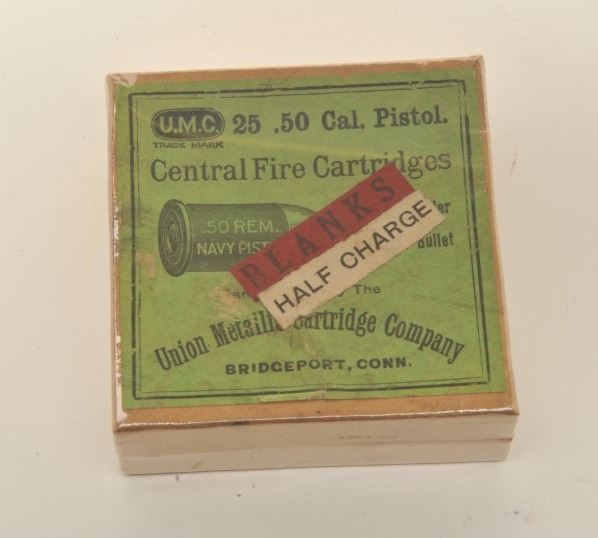 Full box of UMC .50 caliber blanks/half charge for the Remington Navy pistol. Est.: $100-$200.