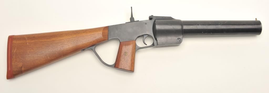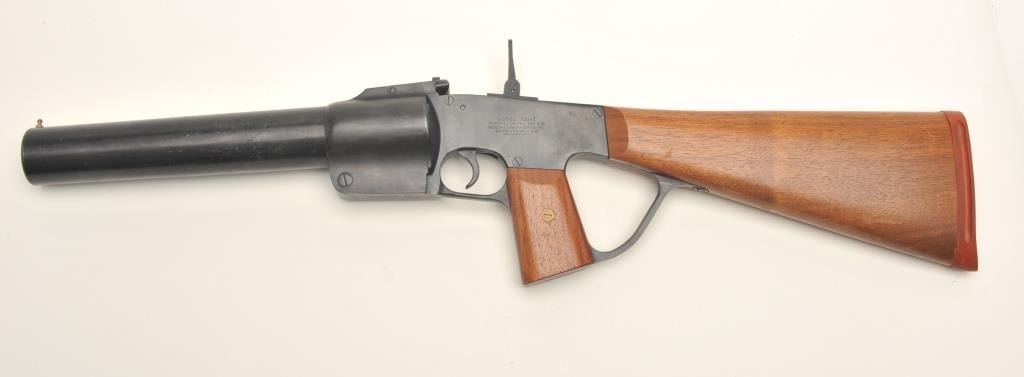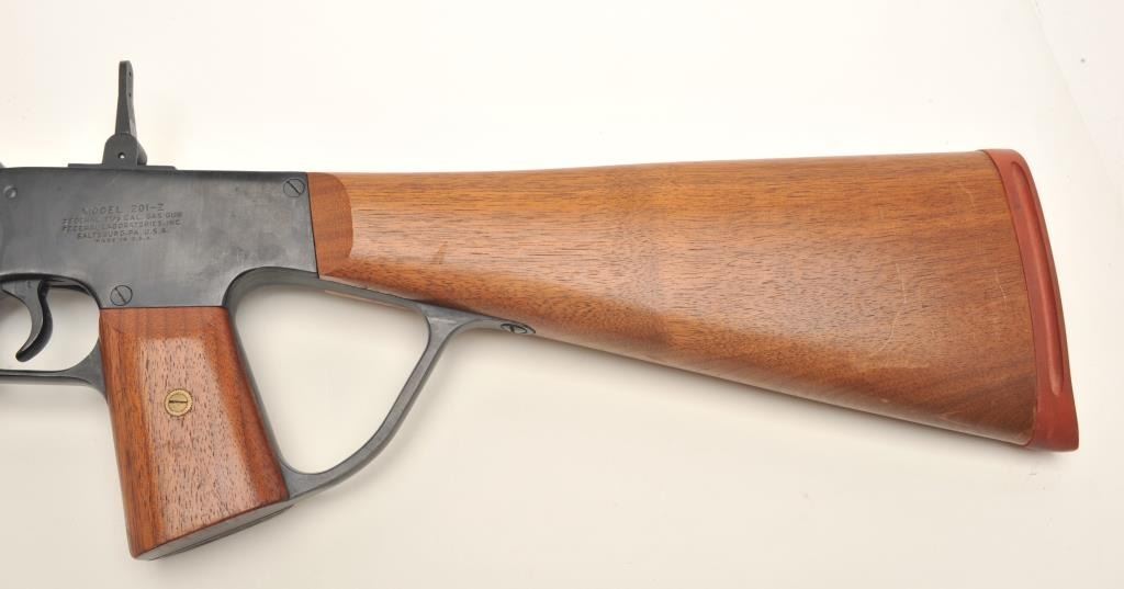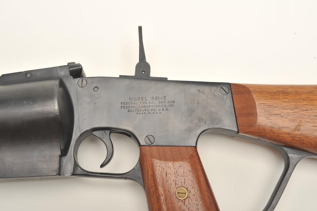 Federal Laboratories Model 201-Z 37mm caliber, tear gas gun, blued finish, wood stocks with hard rubber butt pad; approximately 29” overall, no visible S/N; overall very good condition. Est.:$200-$400.