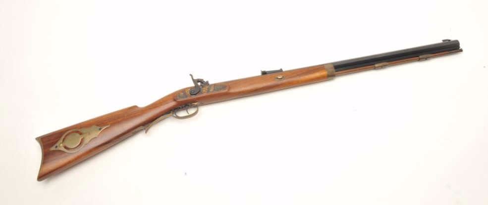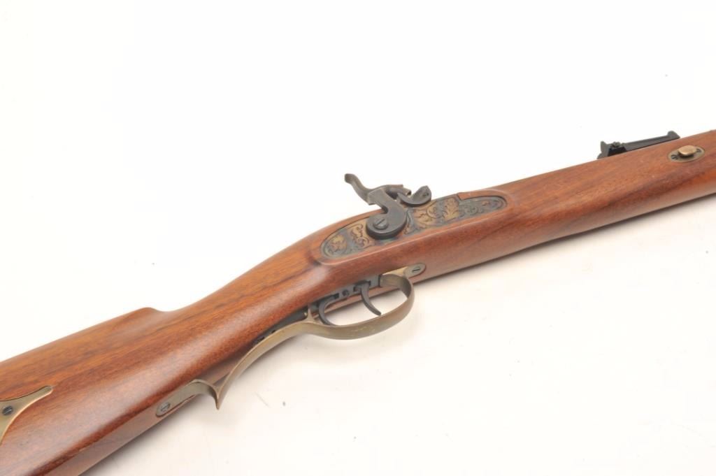Italian made black powder percussion single shot rifle, .50 caliber, serial #204469. The rifle is in very good overall condition with a 28” octagon barrel. The barrel retains nearly all of its blued finish while the side plate is etched with a scroll pattern and features muted case colors. The smooth wood stock is in very good condition with brass hardware including a patch box in the butt and smooth brass crescent butt plate. Est.: $100-$200.
