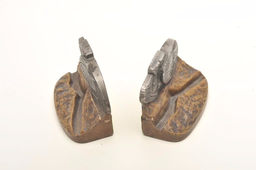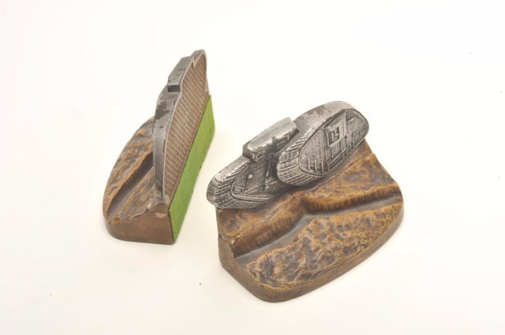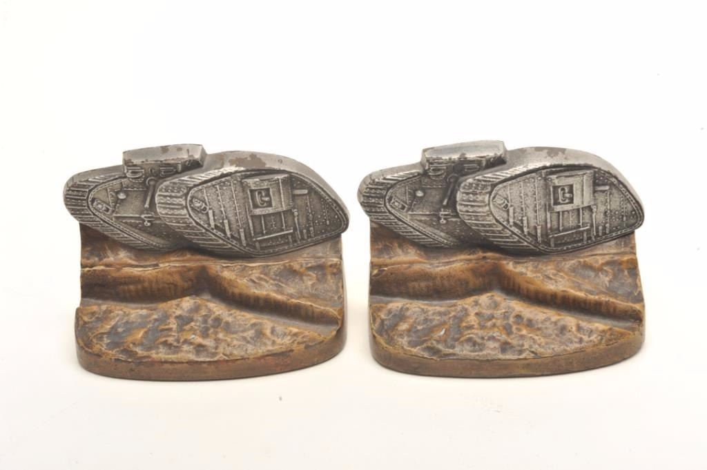 Lot 691 Pair of WW I era heavy metal book ends with military tanks; approximately 4” in height, 6” wide an