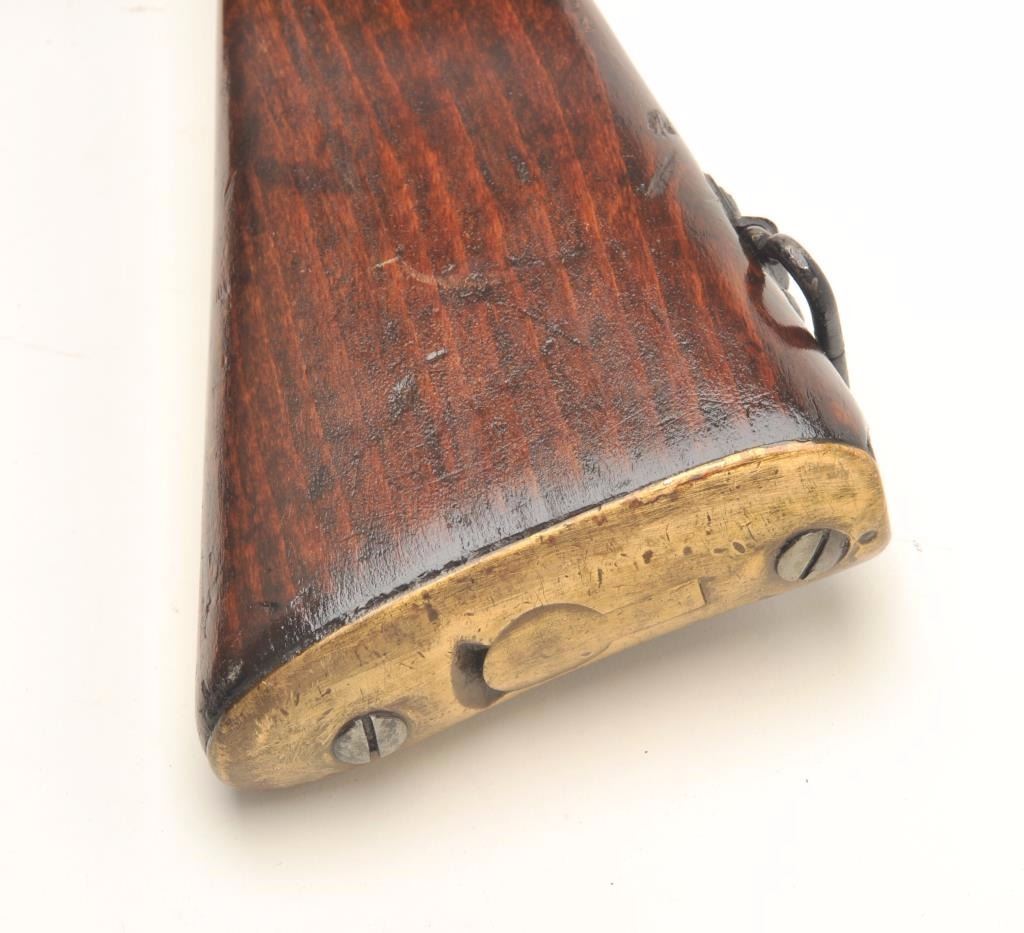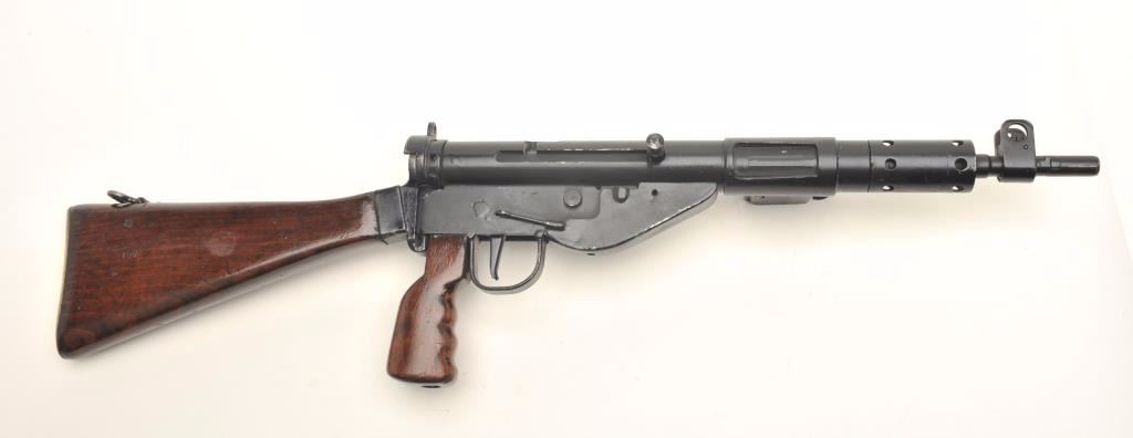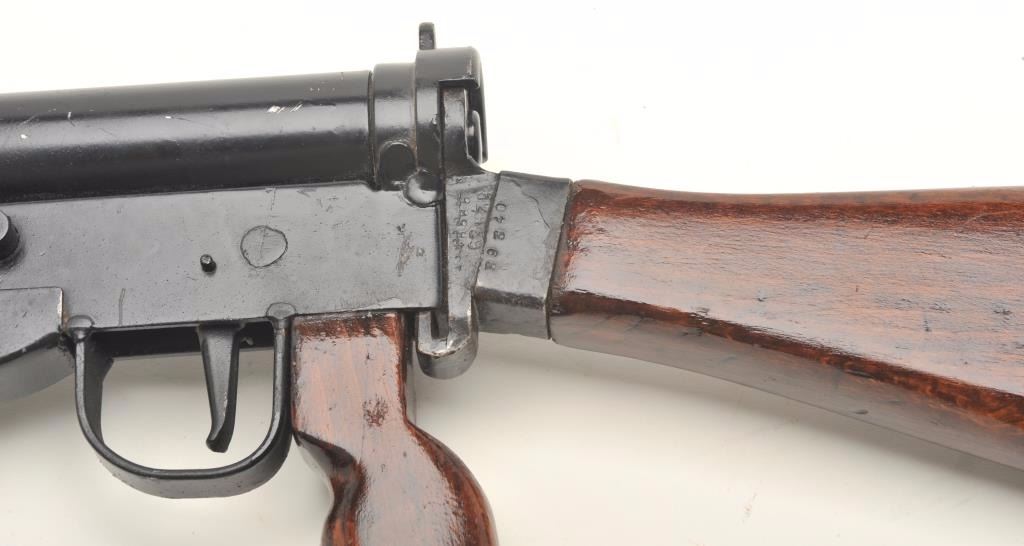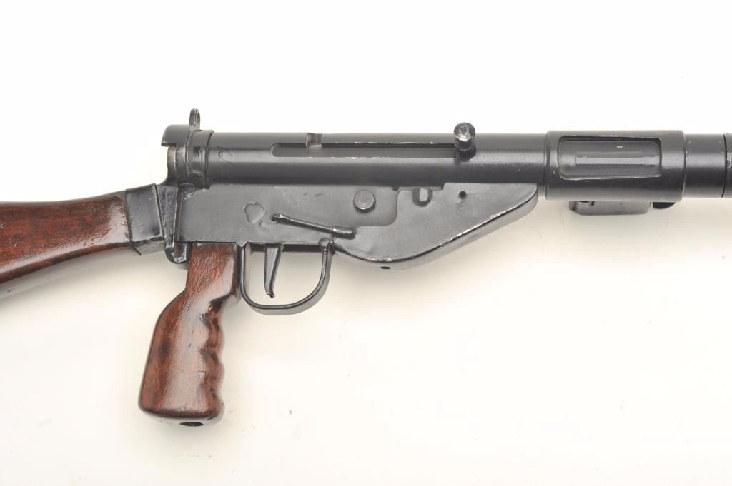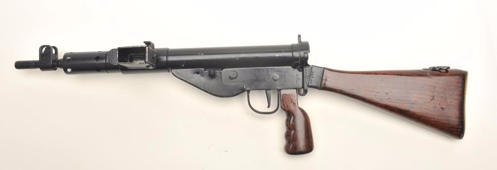 English Sten MK 5 prop gun. This non-firing replica has the bolt welded shut and the bore plugged, otherwise it gives every appearance of a WWII Sten gun. The barrel and receiver have been painted black while the stock andpistol grip are wood. The butt plate has been fashioned from an old, Enfield brass butt. Est.: $125-$250.