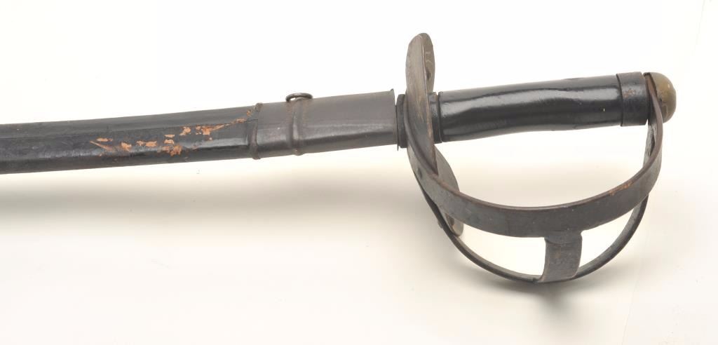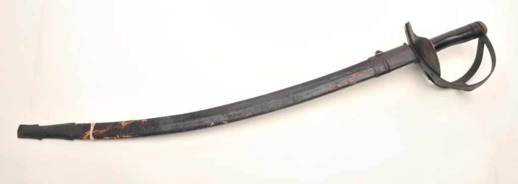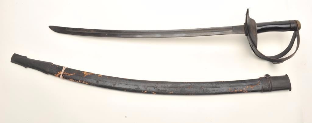 Unmarked cutlass with wrapped wood scabbard, ca. 20th Century, approximately 40” overall; scabbard is broken at bottom end but can be restored. Est.: $50-$70.