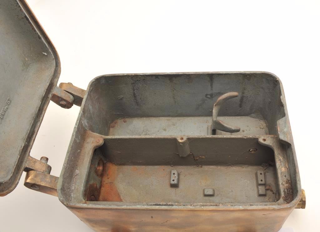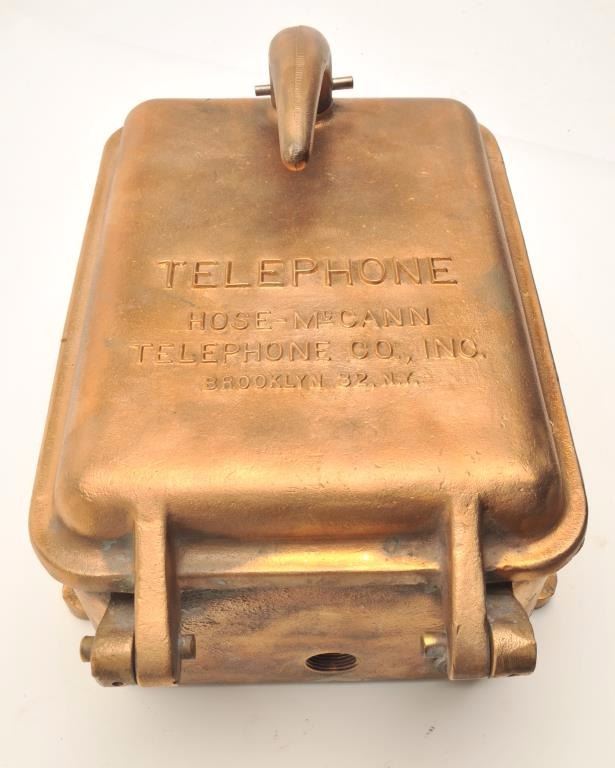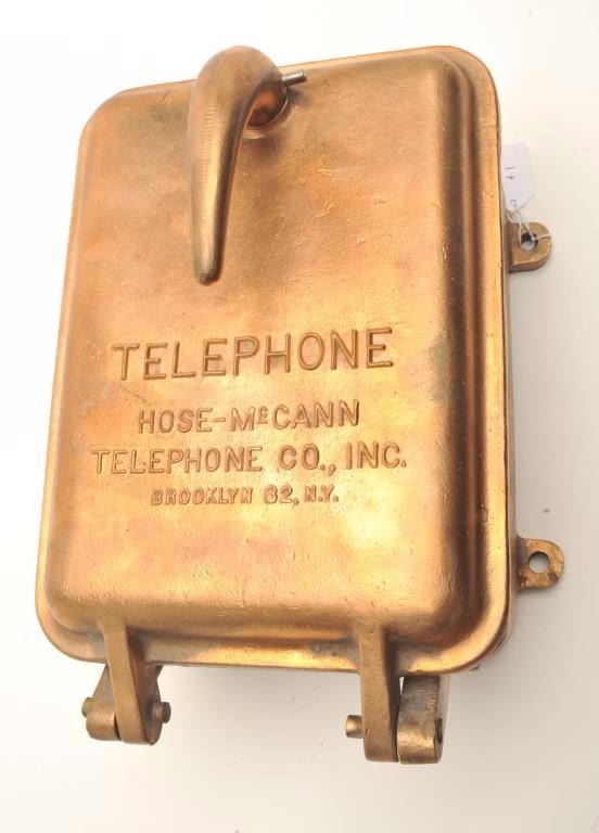 U.S.N. brass shipboard phone box, approximately 13” x 10” x 10”; marked “Hose McCann Telephone Co., Inc./Brooklyn 82 N.Y.”. Est.: $50-$100.