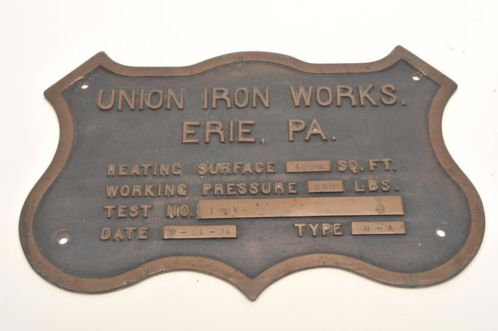 Brass builder’s plate “Union Iron Works/Erie, PA”; dated “5-24-34”; approximately 11” x 17”. Est.: $50-$100.