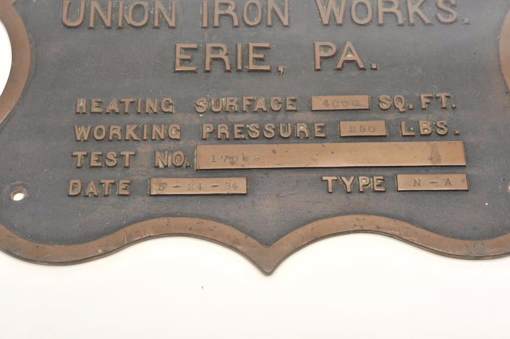 Lot 707 Brass builder’s plate “Union Iron Works/Erie, PA”; dated “5-24-34”; approximately 11” x 17”.