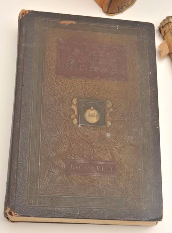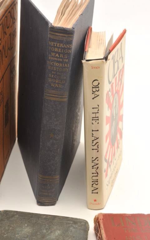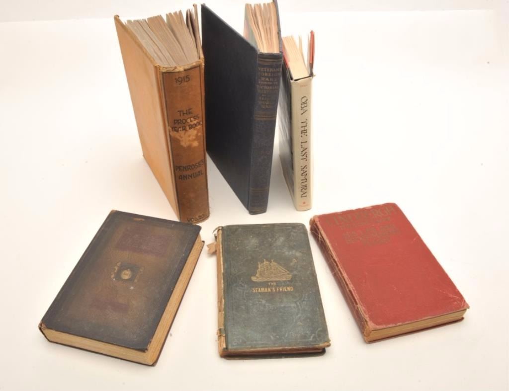 Lot of 6 old hardback books including “Lindbergh, The Lone Eagle; His Life and Epoch Making Flight” (copyright 1927); “The Rough Riders” by Theodore Roosevelt (copyright 1923); Vol. 20 of Penrose’s 1915Annual; “Veterans of Foreign Wars edition of the Pictorial History of the Second Work War” (1948) plus others; varying conditions. Est.: $50-$100.