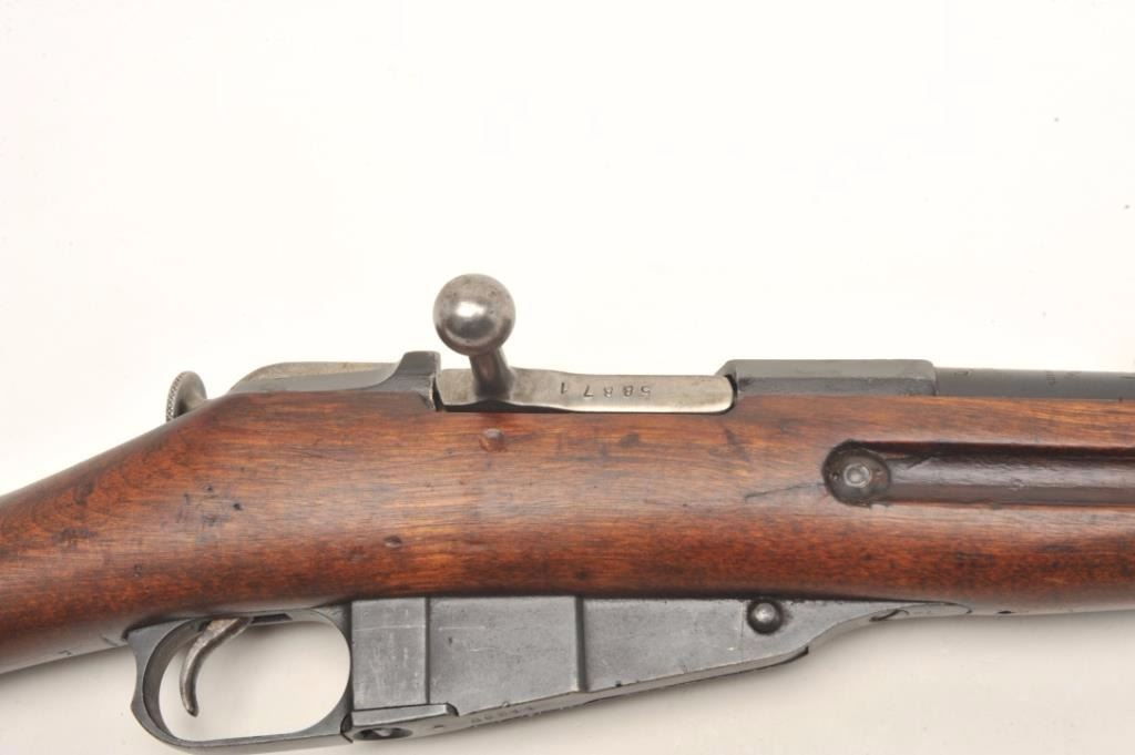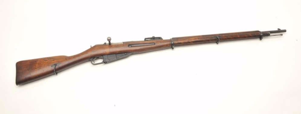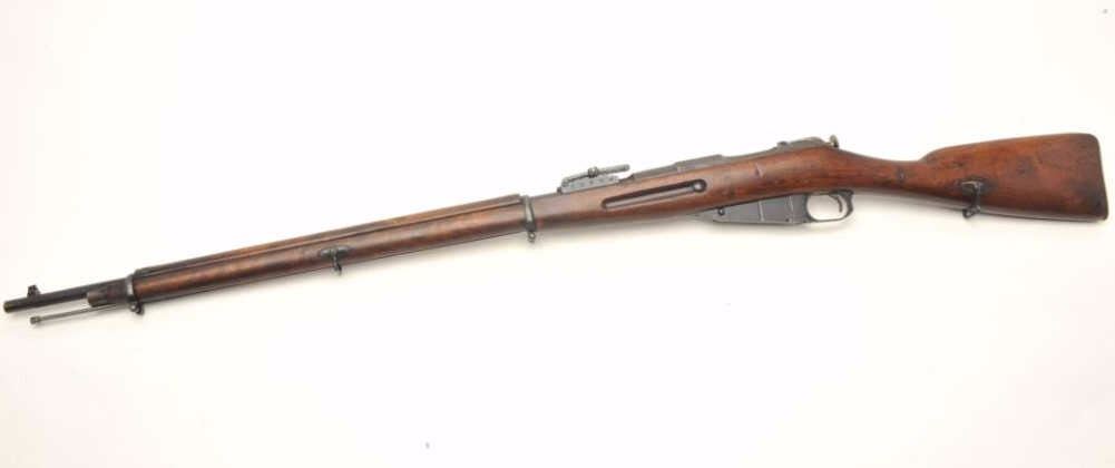 M91 Mosin Nagant bolt action rifle, 7.62 x 54 caliber, serial # N58871. The rifle is in good overall condition with a 32” barrel with a post front and military tangent style rear sights. The barrel and receiver retain asignificant amount of the military finish with light rust and moderate surface erosion noted. The smooth wood stock is in good condition showing heavy use with small mars dents and compressions. The butt stock has a small cartouche on the right side and behind the trigger guard. The butt stock includes sling swivels and ends with a smooth metal butt plate. The bore is good, the action functions and markings are crisp on thisNagant. Est.: $125-$250. (C+R).