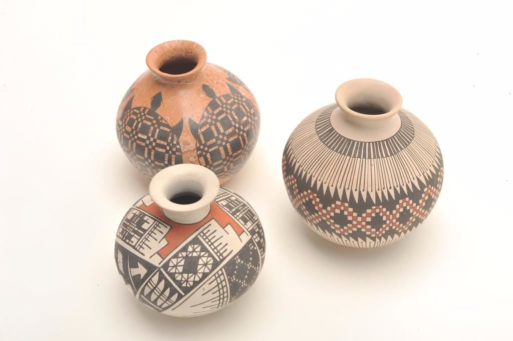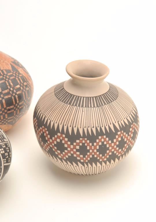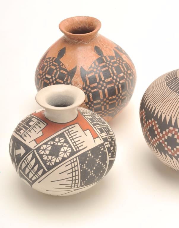 Lot of 3 small Indian pots; 1 an un-marked piece with turtle designs, approximately 4.5” in height; 1 an Acoma approximately 4” in height and signed “Betty Quizada”; 1 marked “Juan Mora”; approximately 4.5” in height; anice grouping. Est.: $125-$175.