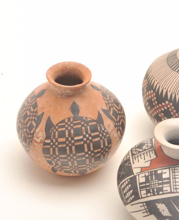 Lot 731 Lot of 3 small Indian pots; 1 an un-marked piece with turtle designs, approximately 4.5” in height