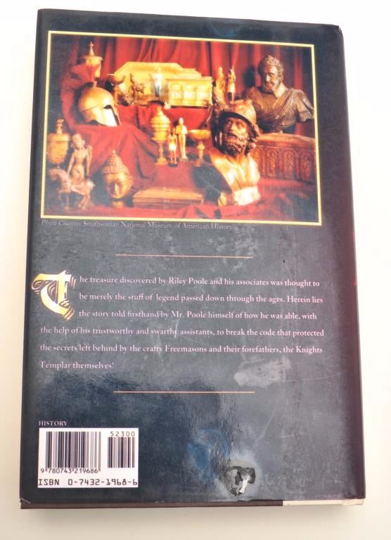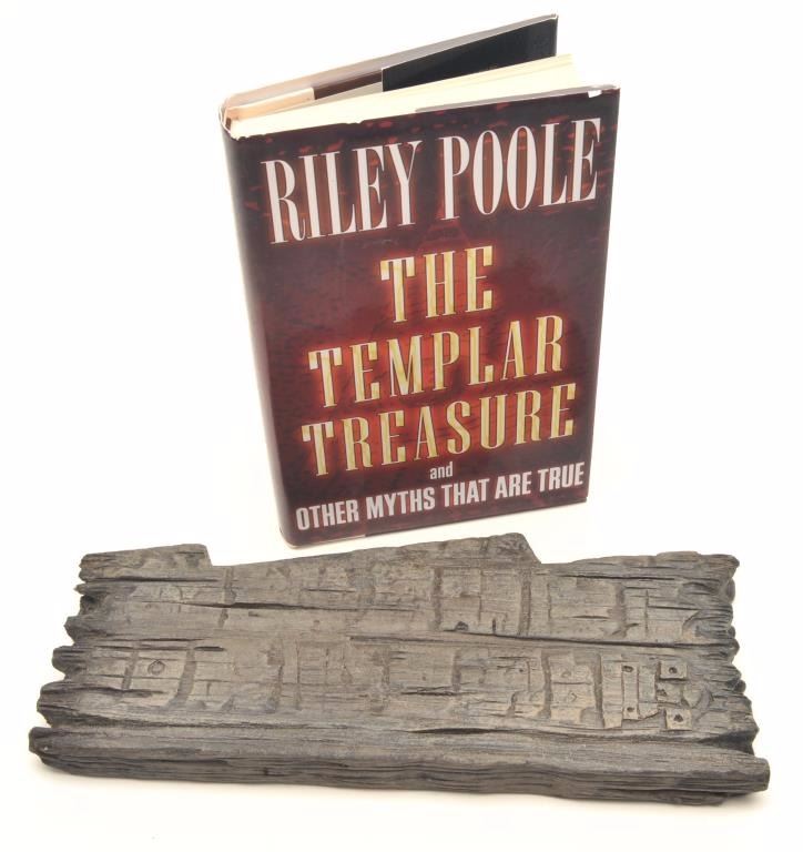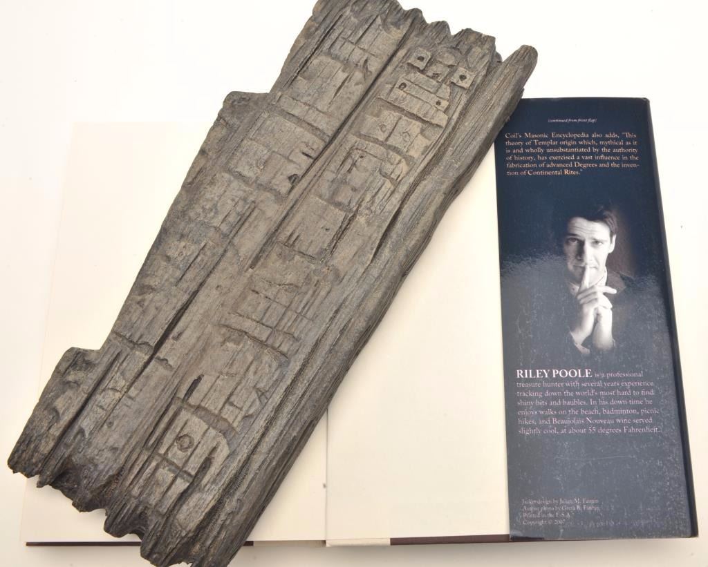 A foam rubber simulated wood fragment of a map used as a prop in the movie “National Treasure”, starring Nicolas Cage, approximately 5” x 12”, accompanied by a hardback copy of “Kockroach” by Tyler Knoxwith dust jacket cover for Riley Poole’s “The Templar Treasure”. Est.: $100-$200.