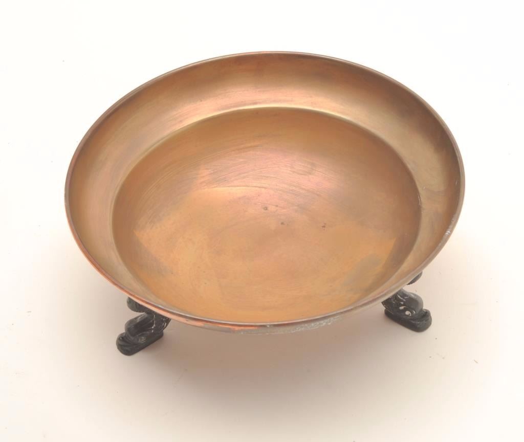 Antique footed figural solid Copper bowl with Koi fish feet; by Karr Craft of New England, approximately 2.5” in height and 6.5” in diameter at rim; very good condition. Est.: $50-$100.