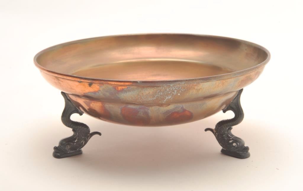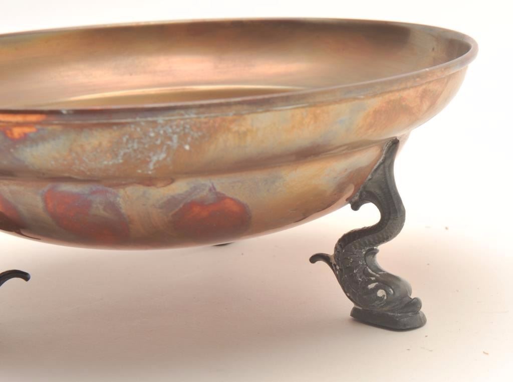 Lot 746 Antique footed figural solid Copper bowl with Koi fish feet; by Karr Craft of New England, approxi