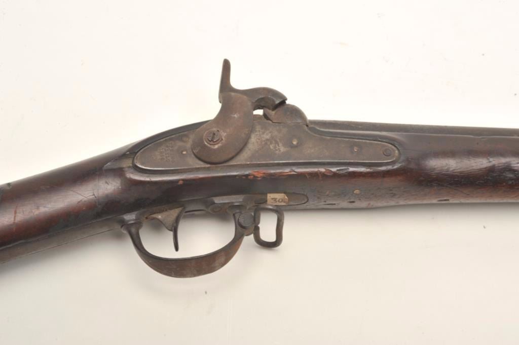 U.S. Springfield percussion rifle dated 1850, .69 caliber, 42” barrel, full wood stock, flared iron ramrod; “out-of-the-attic” condition, working action, well worn stock with initials “N.D.B” and “18” carved intothe left side of the butt stock; also “J M” on the left side of stock above the trigger guard; fascinating hand written note provided by the consignor stating “The famous Yankee rifle of the War Between the States (never,if a Southerner, call it Civil War). When Yankee soldiers were quartered at the Howard home during the War somehow this gun was left behind. Whose initials are carved upon the handle? We do not know. It remains a symbolof that saddest ____ in U.S. history”. (Antique). Est.: $200-$400.