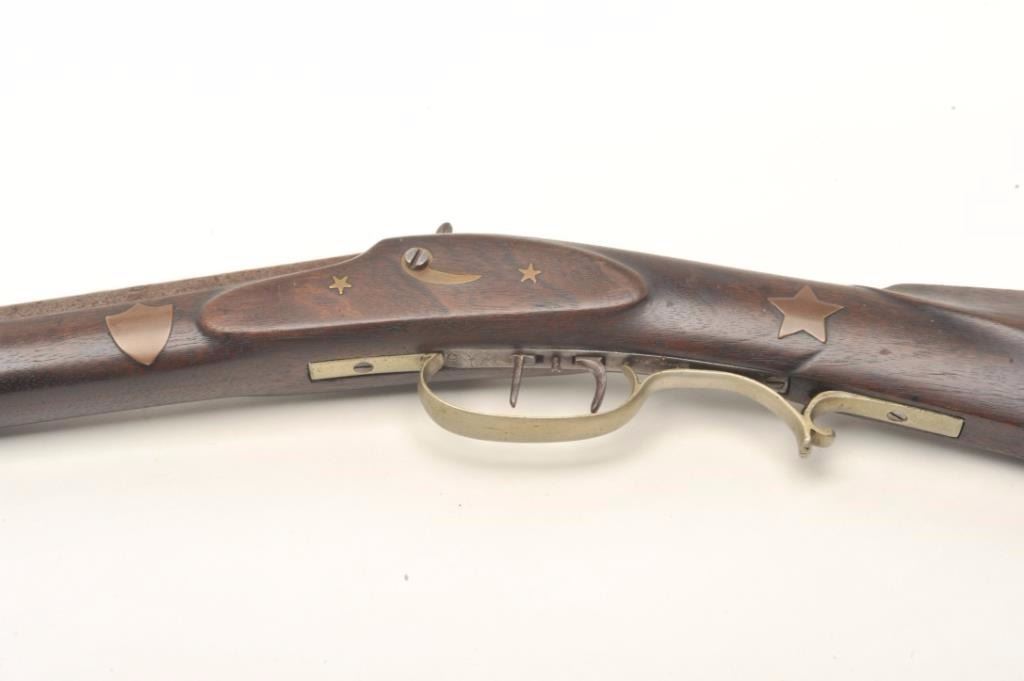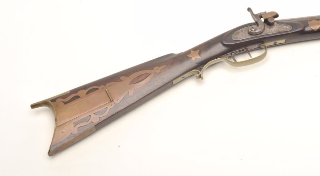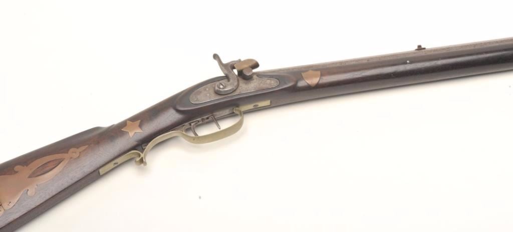 Late half stock percussion American rifle/transition style from Kentucky to plains; small caliber (.32), brass patchbox and many inlays of stars and two shields; double set triggers that are working at timeof description, good wood and pewter forend cap. (Antique). Est.: $350-$700.