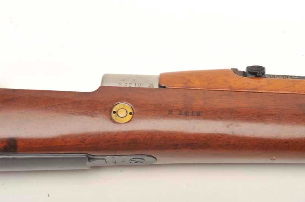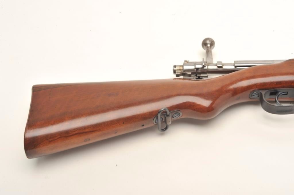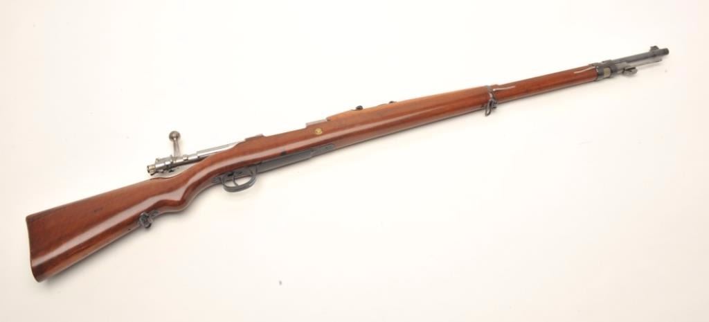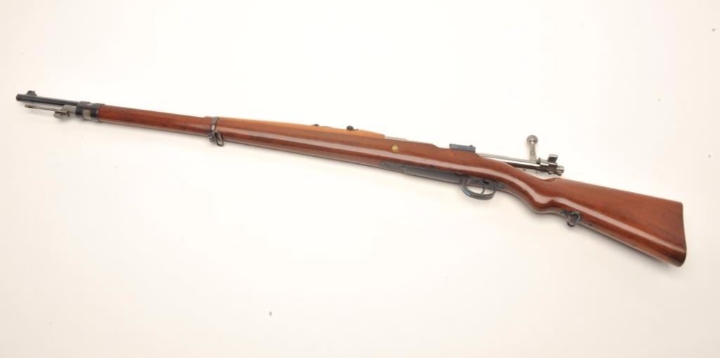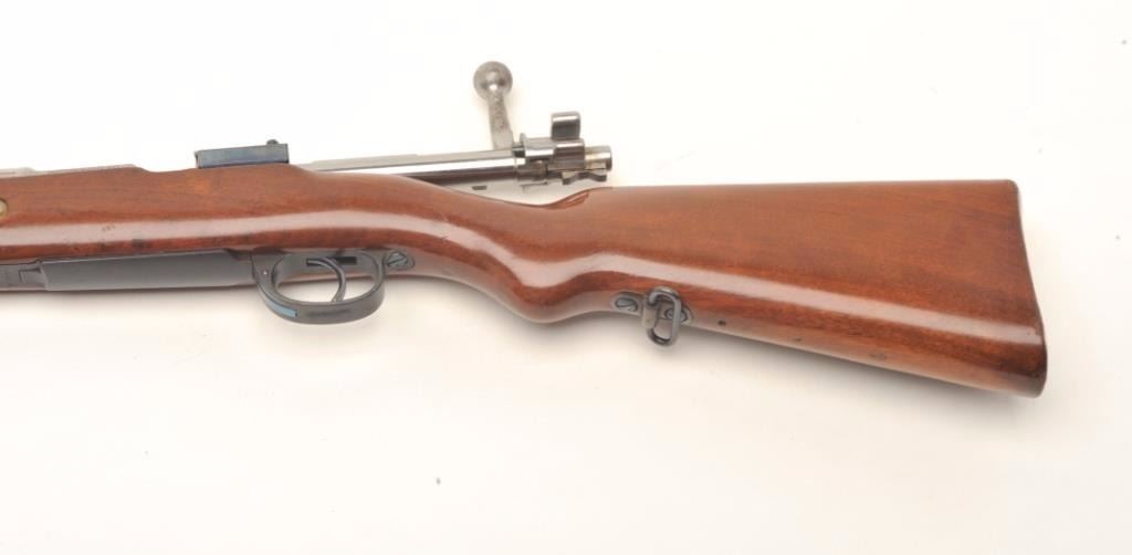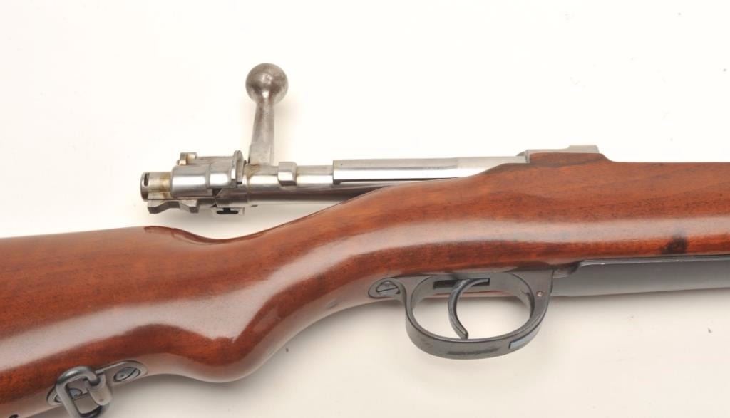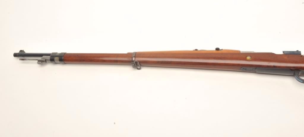 Argentine Mauser Model 1909 bolt action rifle, 7.65mm caliber, 29.5” barrel, blued finish on barrel with receiver “in the white”, wood stock, S/N E2218, all matching, in overall fine condition with a fine bore,crisp action, sharp markings and fine wood with some scattered light marring on the left side of butt stock; bright niter blue on the bolt release; removal of what appears to be a Driver’s License number on the bottom ofthe trigger guard (C&R). Est.: $400-$800.