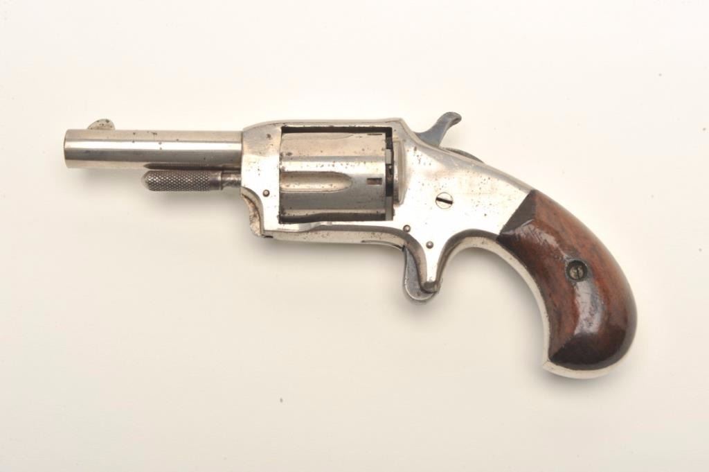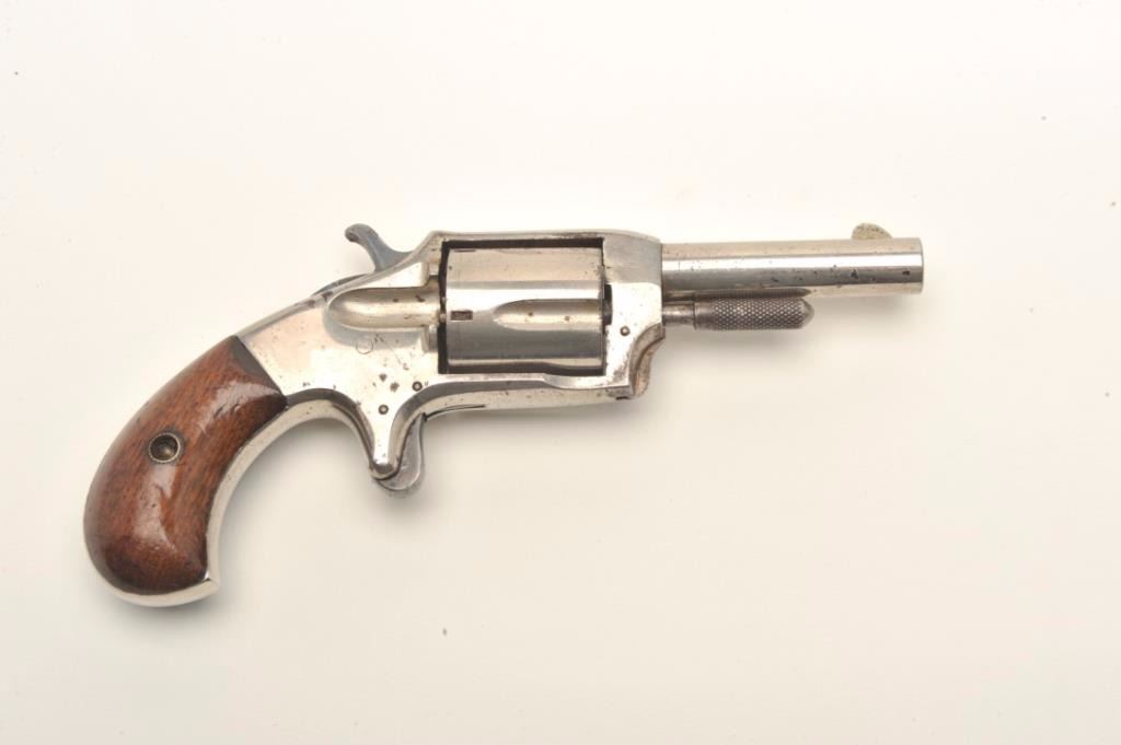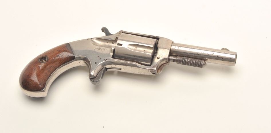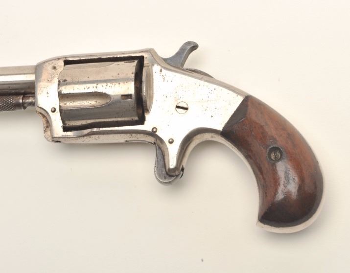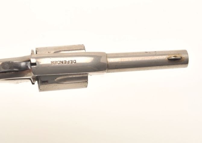 Spur trigger revolver marked “DEFENDER” on top of barrel, .30 caliber, 2.5” round barrel, nickel finish, wood grips, overall good condition showing the majority of its finish, good markings and grips, action cocks but cylinder does not rotate. (Antique). Est.: $150-$300.
