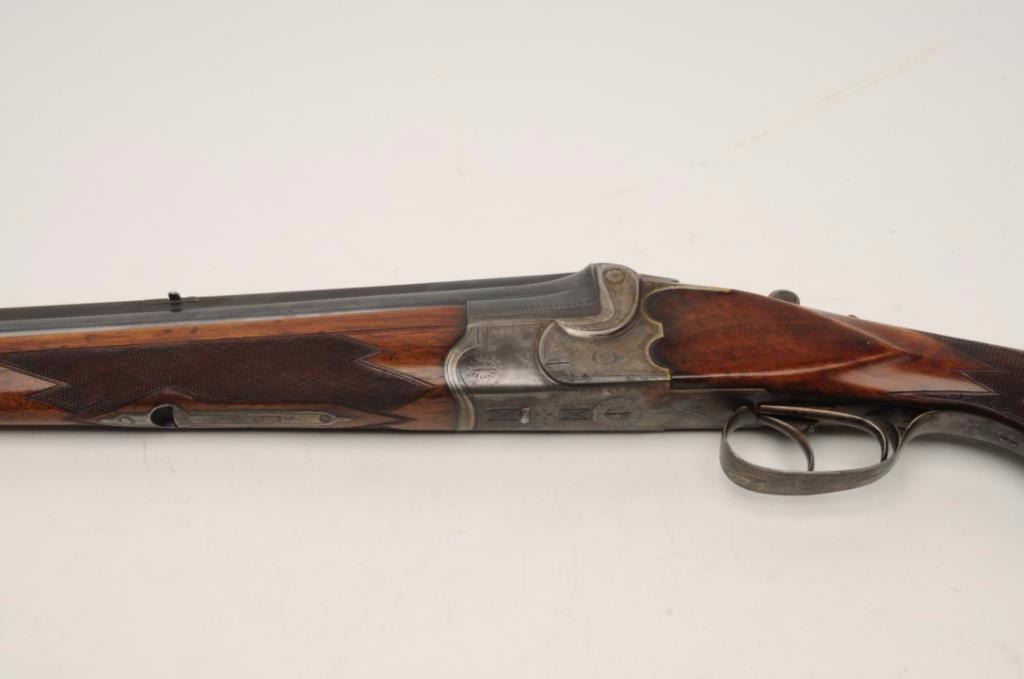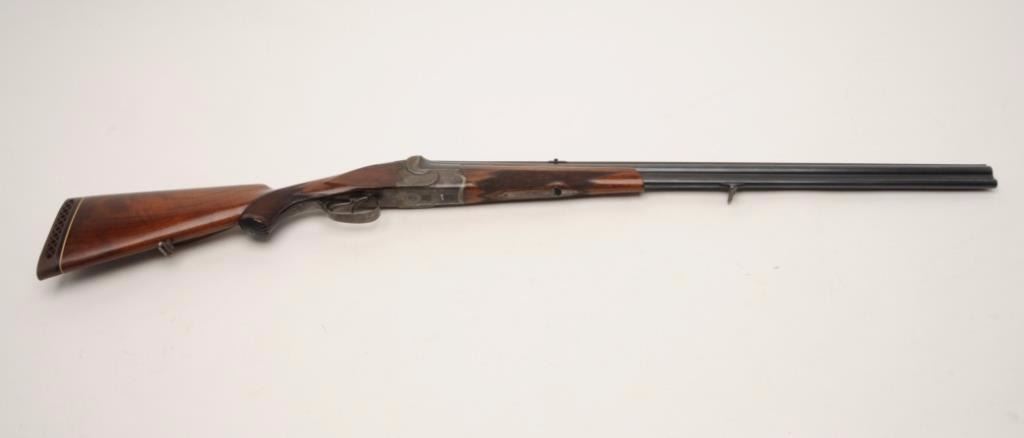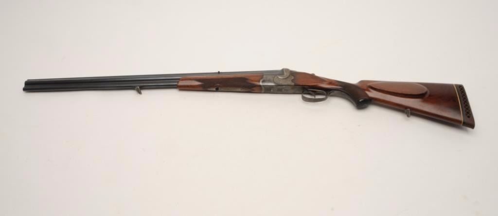 German made over under combo rifle, approximately 8mm and 16 gauge, serial #1857. The rifle is in very good condition with 27 ½” barrels. The barrels a full-length filed rib with post front and folding rear sights. The barrels retain the majority of their toning blued finish with some small scuffs and loss of finish at the muzzle. The receiver shows old, muted case colors, particularly at the tang and ion theunderside of the action. The tasteful scroll engraving extends through the trigger guard to the horn grip cap. The barrels are marked, “Nitro” at the breech and indicate Krupp steel. The finely checkered woodstocks are in good condition with small mars from use and a beaded cheek piece. The butt stock ends with a ventilated rubber pad providing a 14 ¾” LOP to the front trigger. The bores are good, the action crisp andmarkings are sharp. Although there is no maker’s mark noted, the combination gun is clearly a quality pre-war piece. Est.: $500-$800. (C+R).