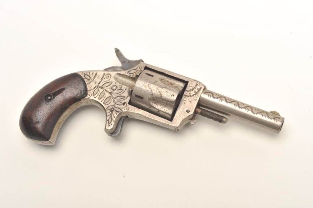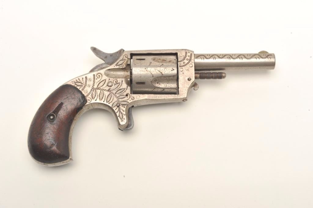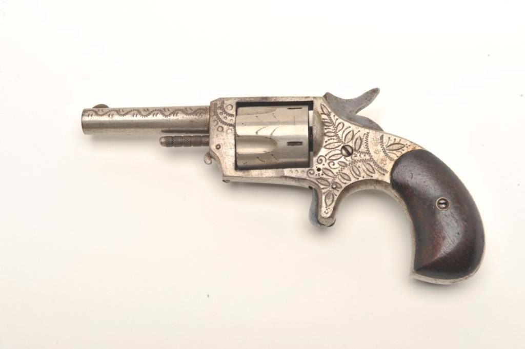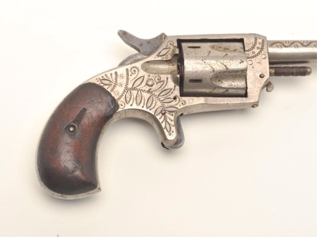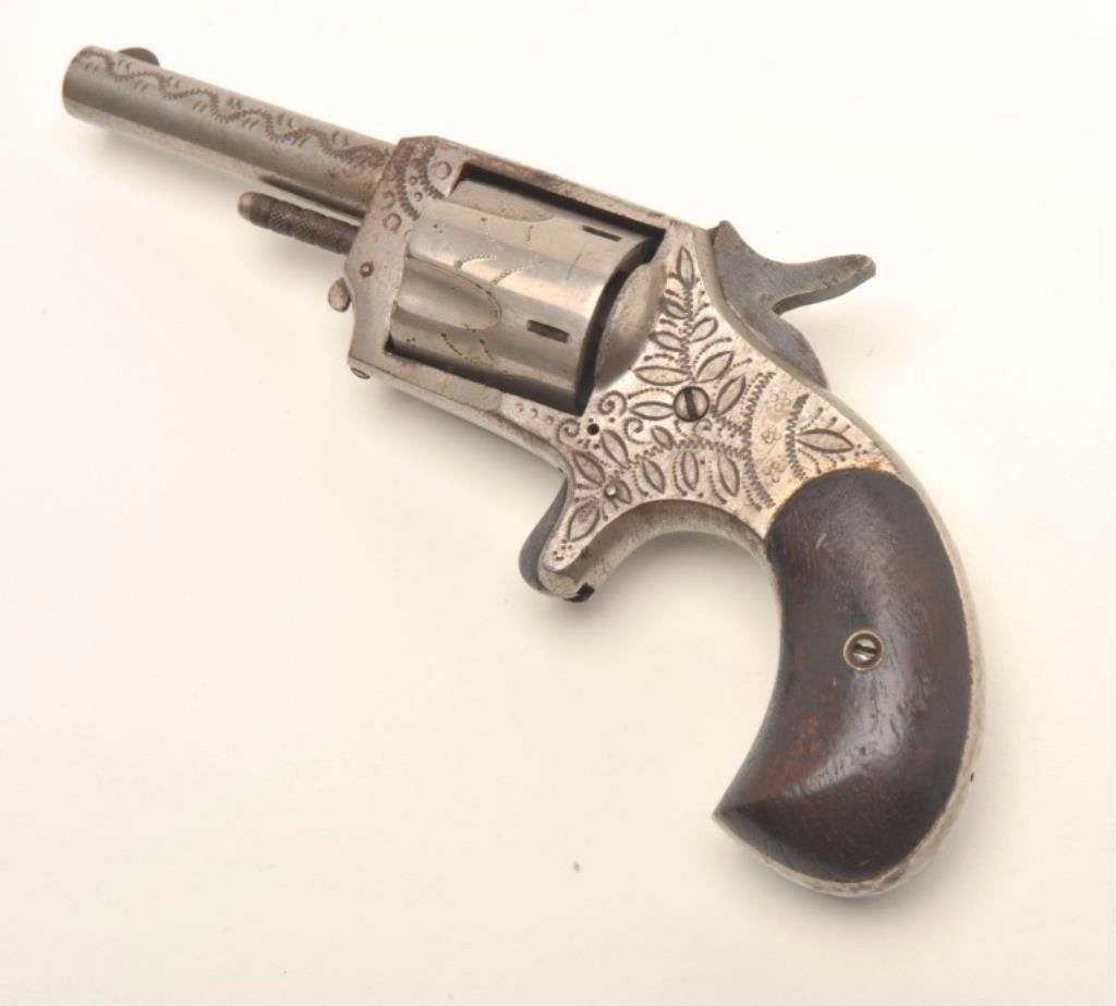Engraved spur trigger revolver, marked “Electric”, .30 caliber, 2.75” round barrel, nickel finish, wood grips, no visible S/N, overall good condition displaying majority of its frosty original nickel finish, actionneeds adjustment, grips are good overall with an old sliver loss on the right grip at the escutcheon. (Antique). Est.: $150-$300.