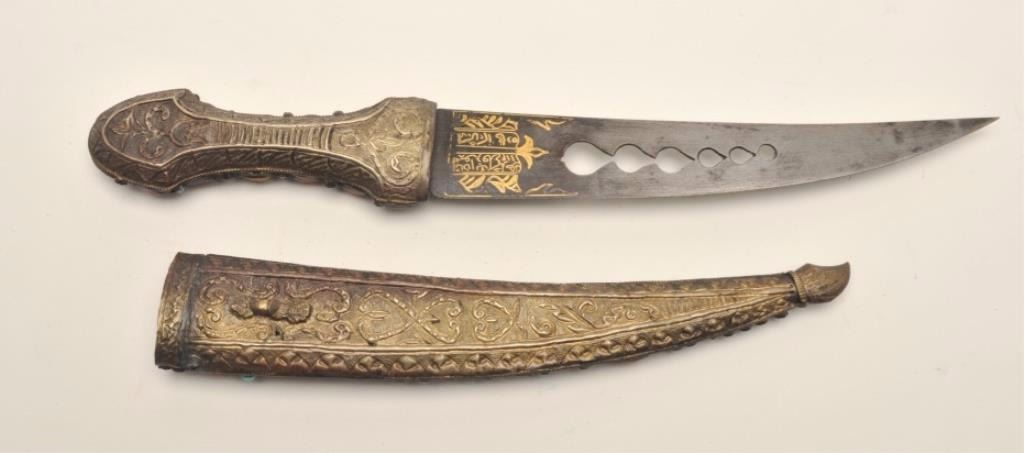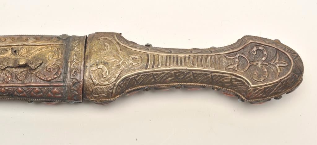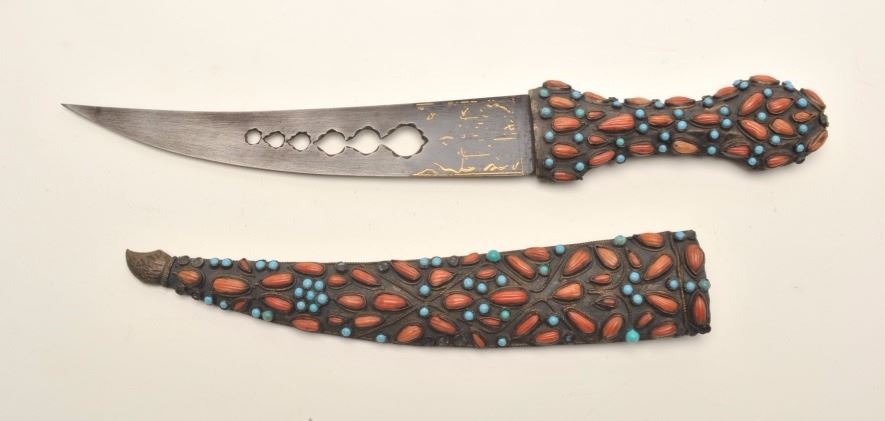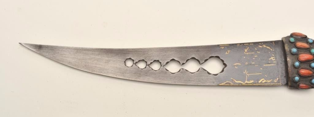 Ornately inlayed Jambiya dagger with coral and turquoise. The dagger is in very good overall condition with an 8 ½” blade and an overall length of 13 ½”. The blade is a grey patina with light surface rust, gold filledinlay at the handguard and no evidence of sharpening. Interestingly, the blade has a series of six holes in the center of the blade descending in size. The handle is heavily inlayed with pear shaped pieces ofcoral and round turquoise stones. The off side of the handle is hammered brass. The scabbard is also heavily inlayed with coral and turquoise, while the remainder features the hammered brass. A high quality Jambiyawith significant ornamentation and a high degree of workmanship. Est.: $600-$1,200.