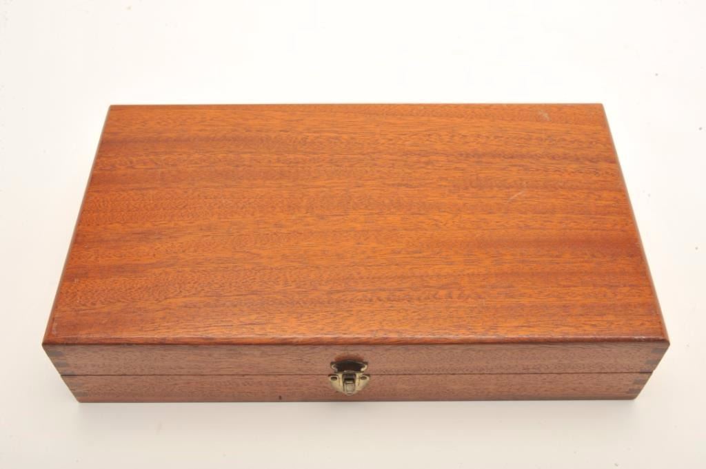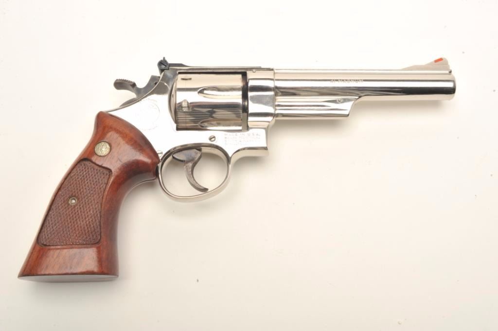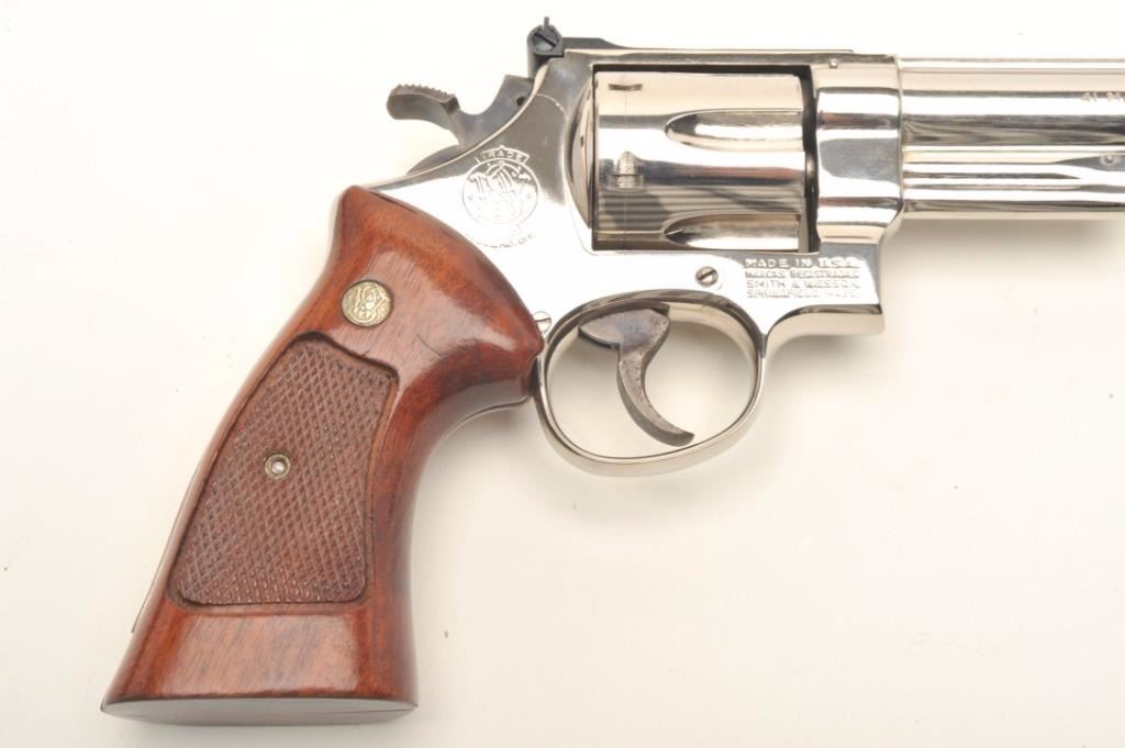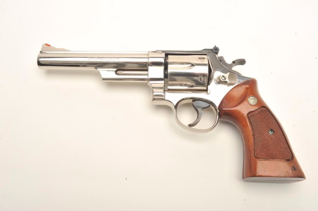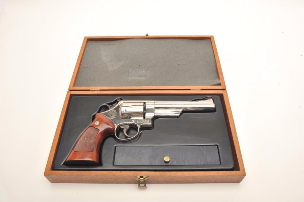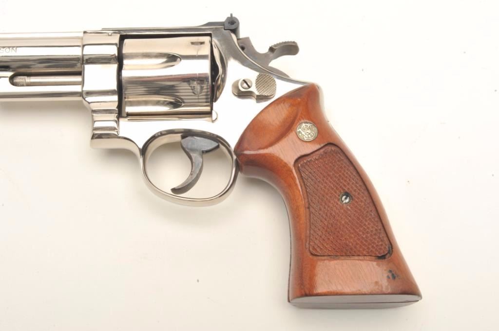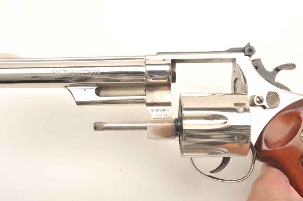 Smith & Wesson Model 57 DA revolver, .41 Magnum caliber, 6” barrel, desirable factory nickel finish, target hammer and trigger, checkered wood medallion combat grips, S/N N836374, pinned barrel, in overall excellentcondition showing minimal firing; accompanied by a factory wood presentation case and cleaning accessories. (Modern/PPT). Est.: $700-$1,400.