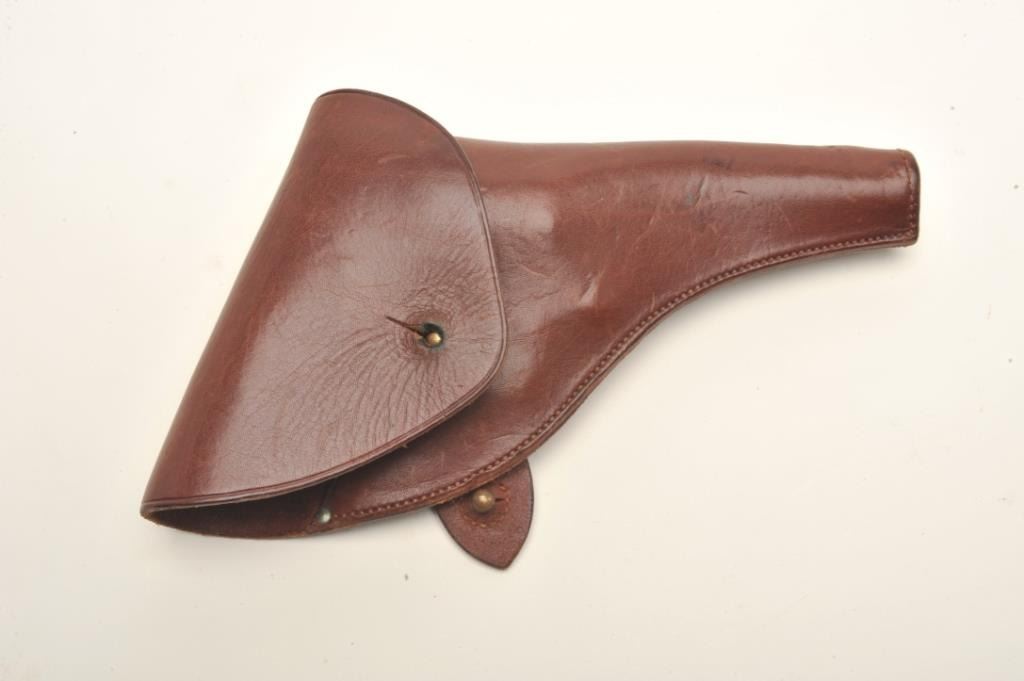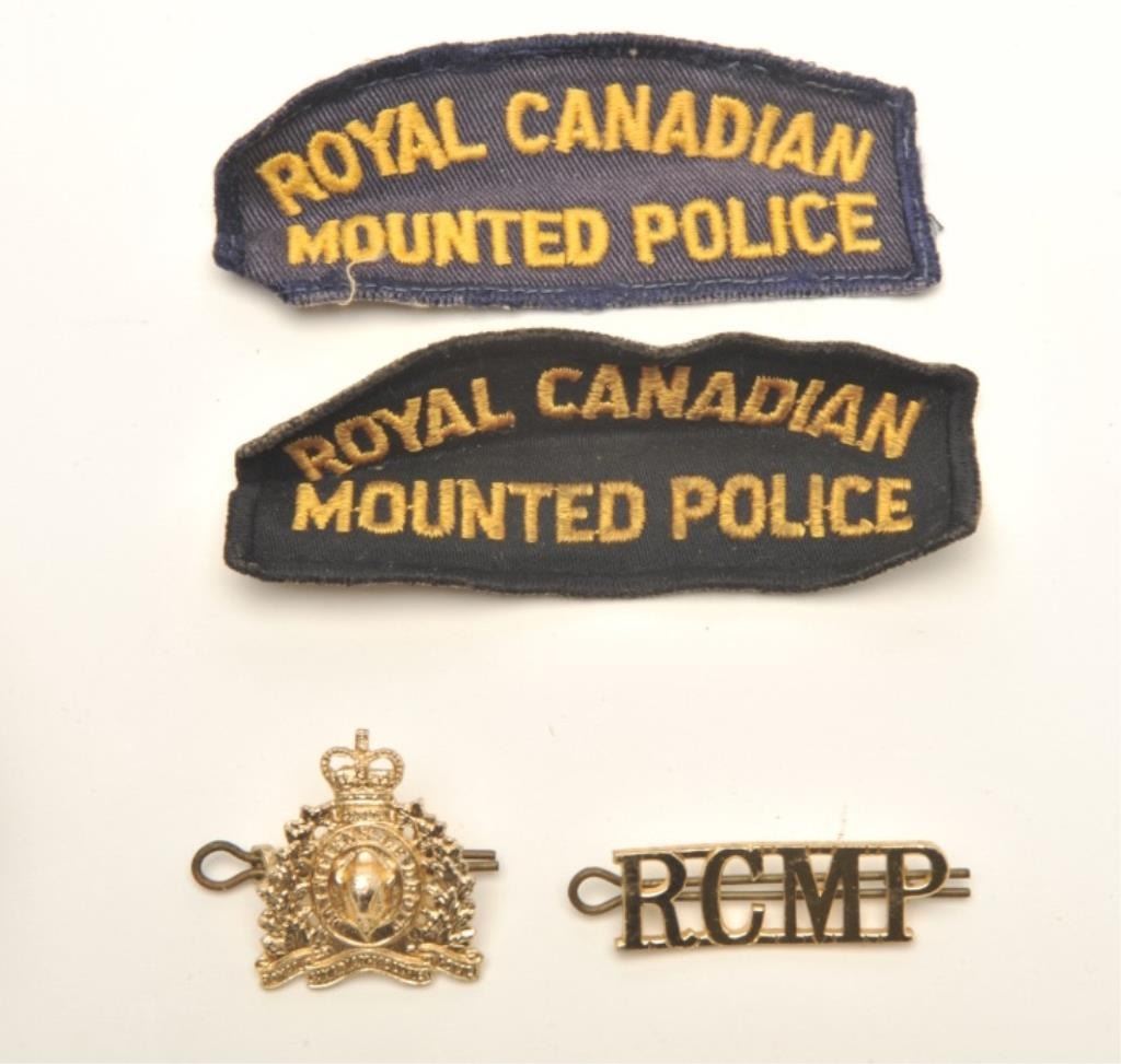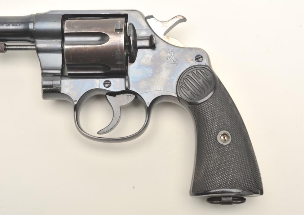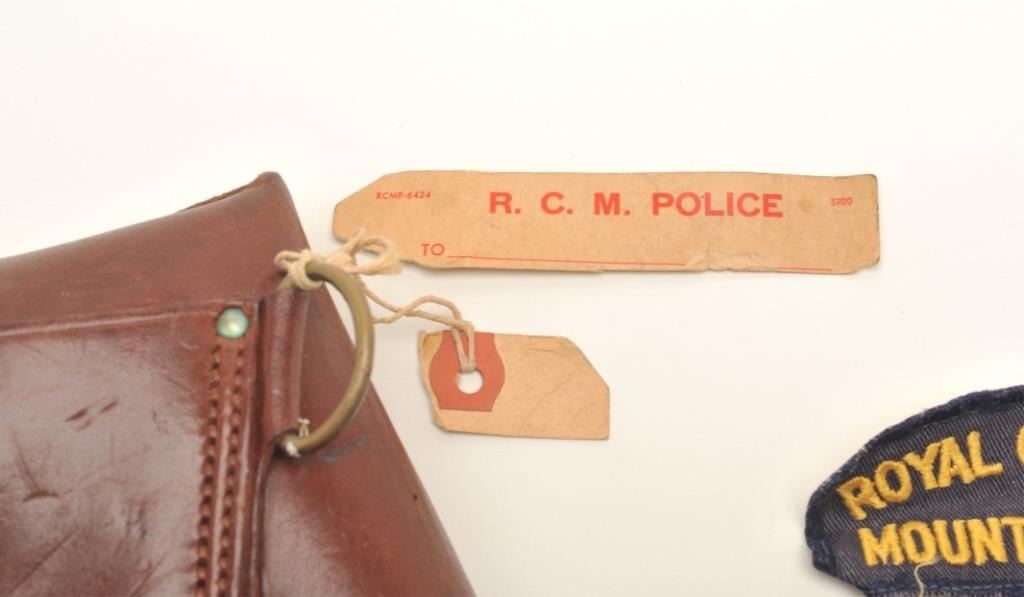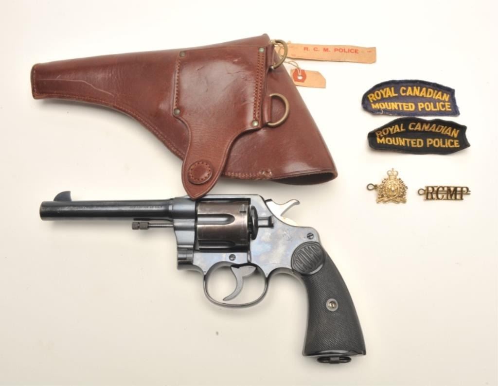 Colt New Service DA revolver, .45 Colt caliber, 5.5” barrel, blued finish, checkered black hard rubber grips, marked on back strap “RNWMP 498” (Royal Northwest Mounted Police) and “MP” on butt strap, S/N 147018,accompanied by a brown leather flap holster, 2 RCMP uniform pins and 2 RCMP uniform patches. The gun is in overall very good + condition showing the majority of its original finish, very good markings, action,bore and grips that display a couple old chips on the bottom of the left grip. The exploits of these lawmen were legendary in Canada; this gun, its holster and accessories are in better shape than most NWMPassociated firearms this cataloger has viewed over the years. (C&R/PPT). Est.: $1,250-$2,500.