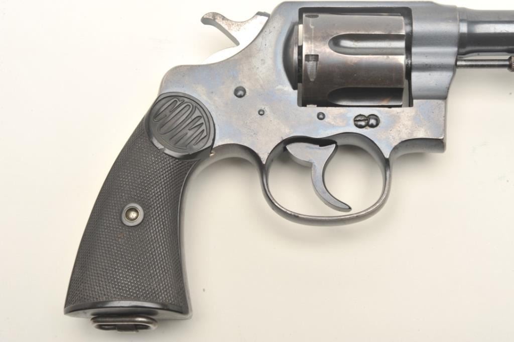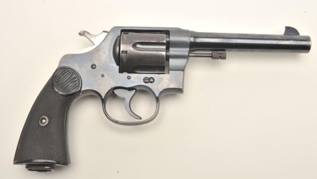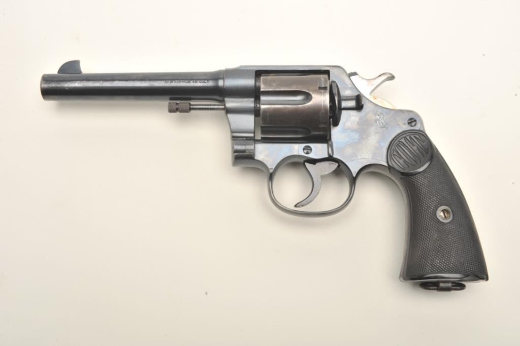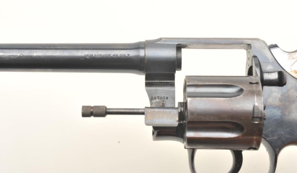 Lot 804 Colt New Service DA revolver, .45 Colt caliber, 5.5” barrel, blued finish, checkered black hard ru