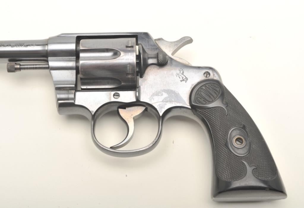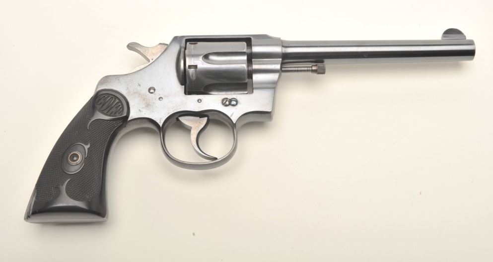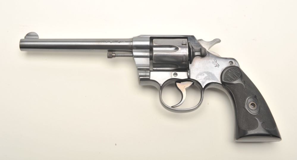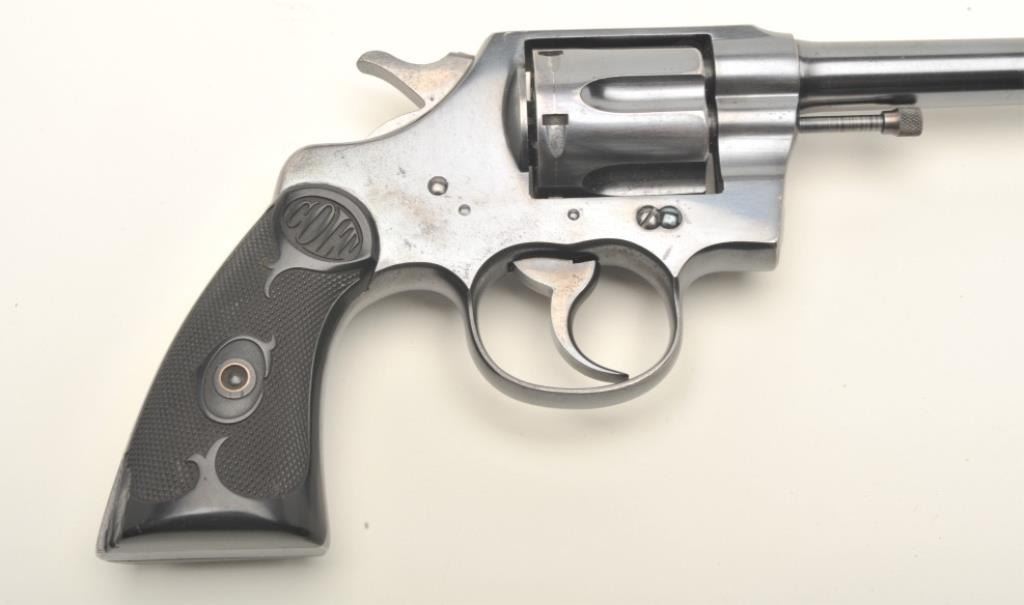 Colt Army Special DA revolver, .38 caliber, 6” barrel, blued finish, checkered black hard rubber grips in overall fine to excellent condition showing approximately 97%+ original blue, crisp action, sharp markings, finebore and very good to near fine grips with an old loss to the rear bottom back side of the right grip. (C&R/PPT). Est.: $1,250-$2,500.