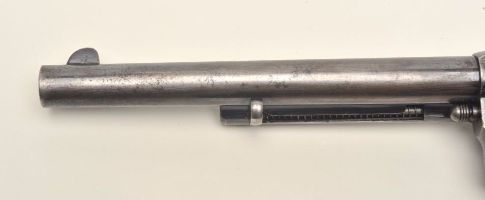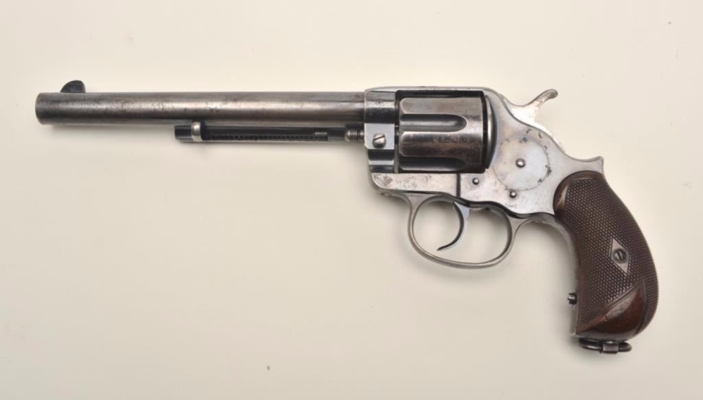 Colt Model 1878 DA revolver, .45 Colt caliber, 7.5” barrel, blued finish, early fat checkered wood grips, S/N 799, in overall very good condition showing considerable original blue finish remaining, very good +bore, crisp action and markings, very good grips. (Antique). Est.: $1,500-$3,000.