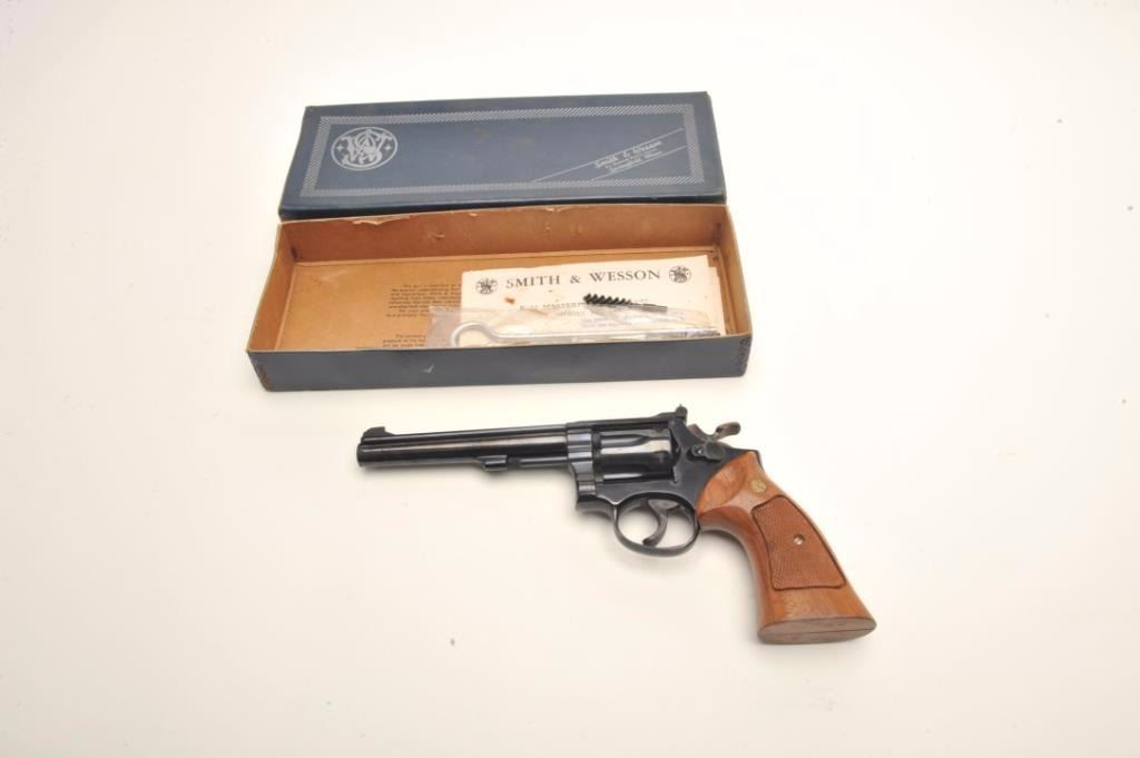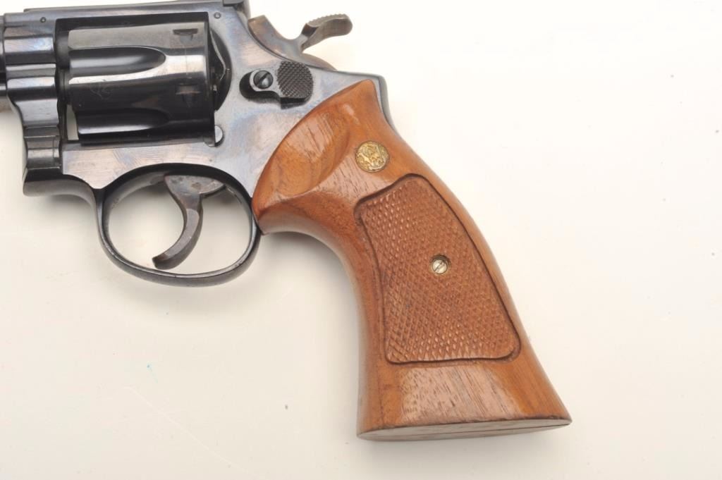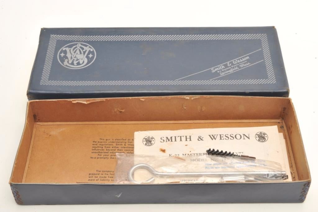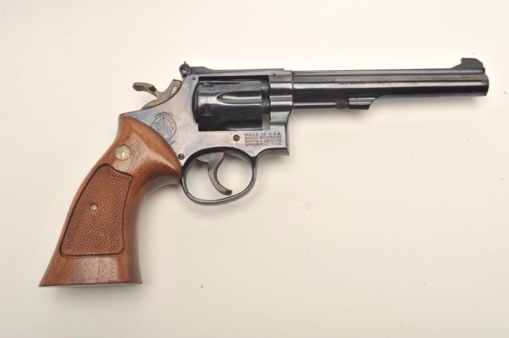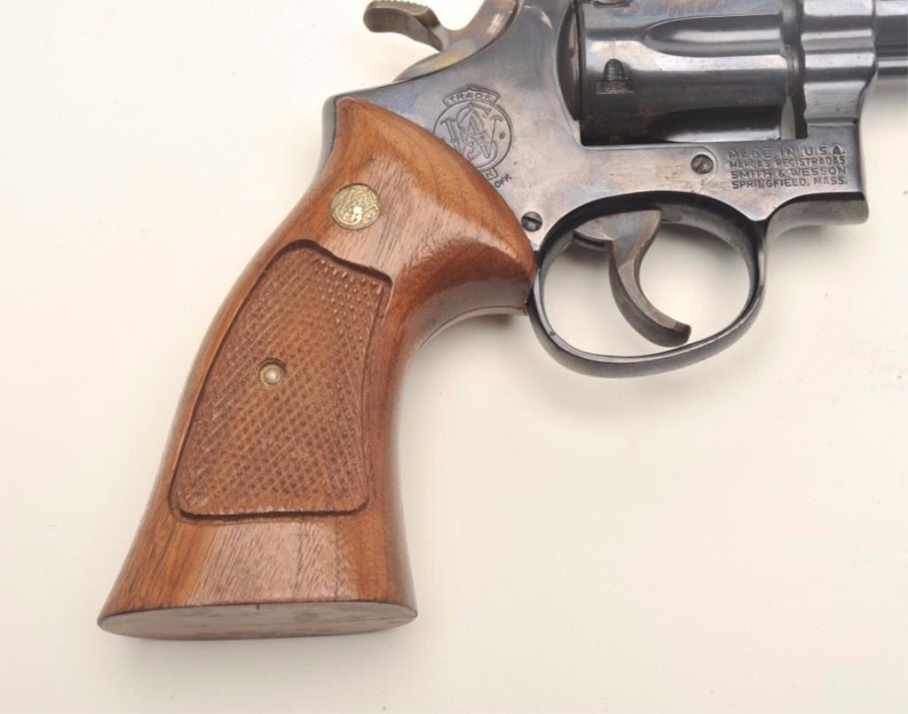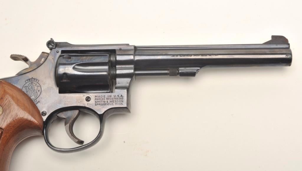 Smith & Wesson Model 17-3 DA revolver, .22LR caliber, 6” barrel, blued finish, target hammer and trigger, checkered wood medallion combat grips, S/N 6K35067, in overall near fine condition showing the majority oforiginal finish, just some scattered small spots of surface erosion from storage, fine bore, crisp action and markings, fine grips; accompanied by a factory two piece cardboard blue box showing end label numbered to thisgun; also with instructions and cleaning rod. (Modern/PPT). Est.: $300-$600.