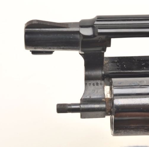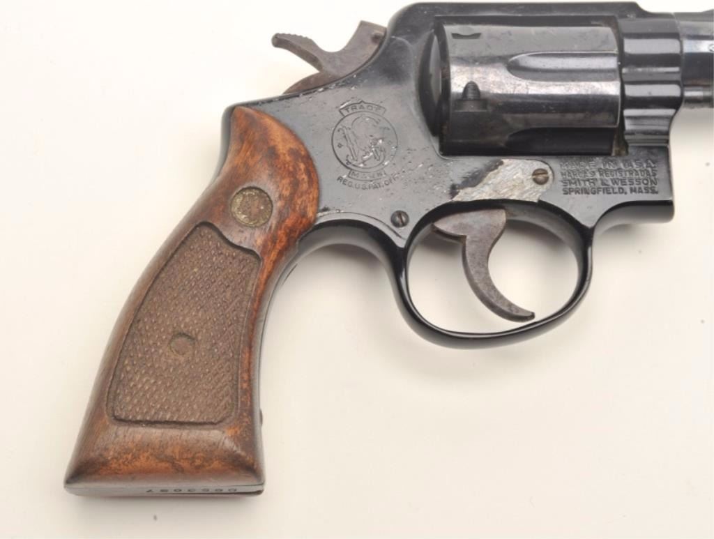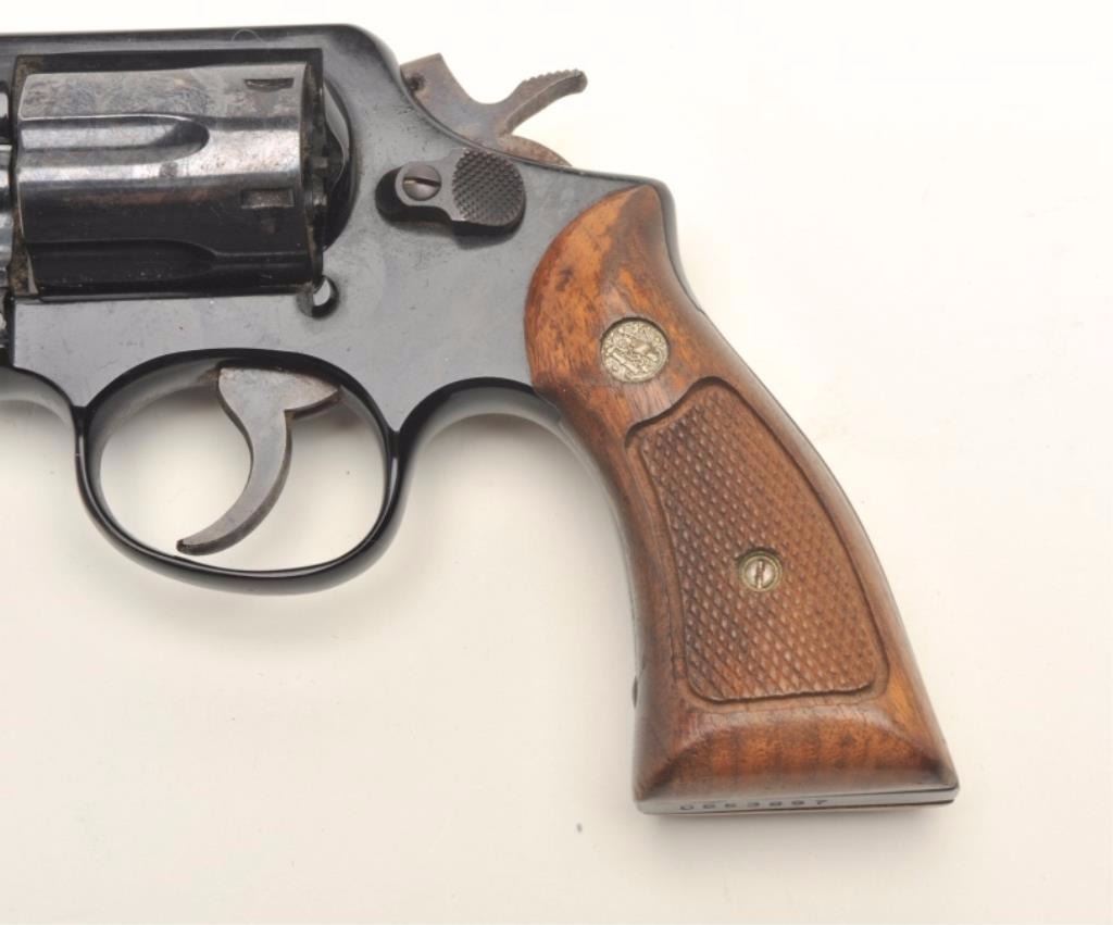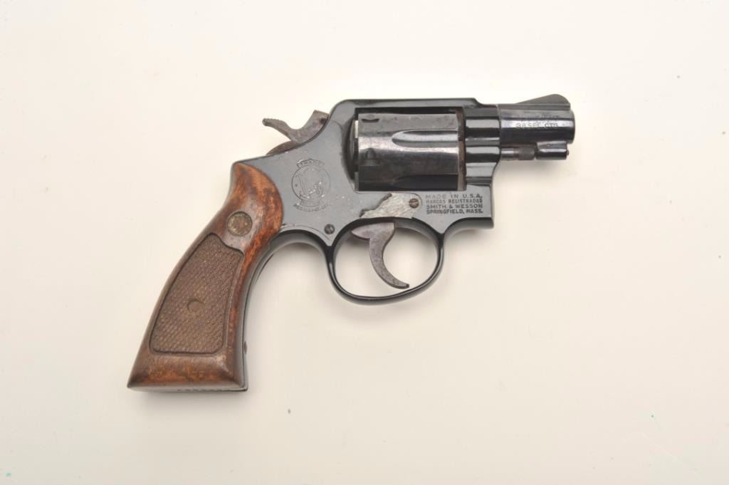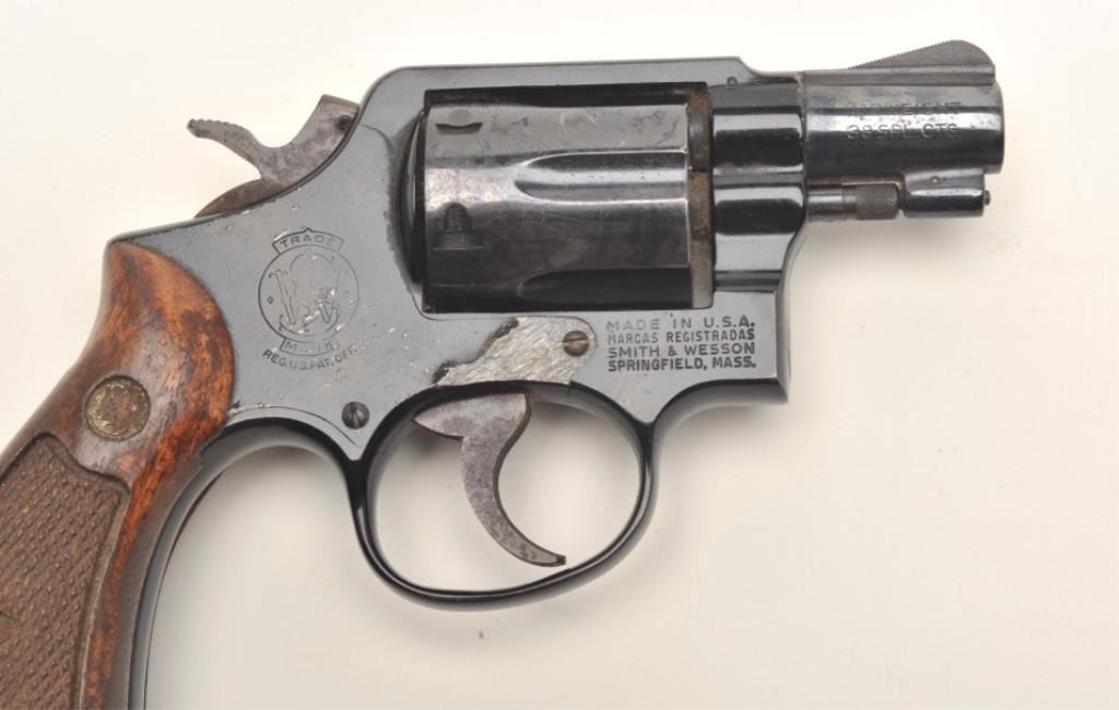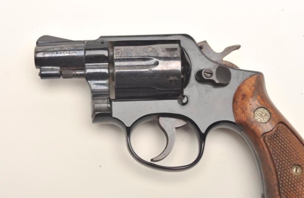 Smith & Wesson Model 12-2 Airweight DA revolver, .38 Special caliber, 2” barrel, blued finish, checkered wood medallion grips, S/N D853897. This gun is in overall fair condition showing poor storage, scatteredspots of erosion with scratching and marking to the right side of the frame; the action and markings are good and there is considerable original finish on the remainder of the revolver; the right grip showssurface damage too with areas of erosion to the trigger and hammer from poor storage. (Modern/PPT). Est.: $100-$200.